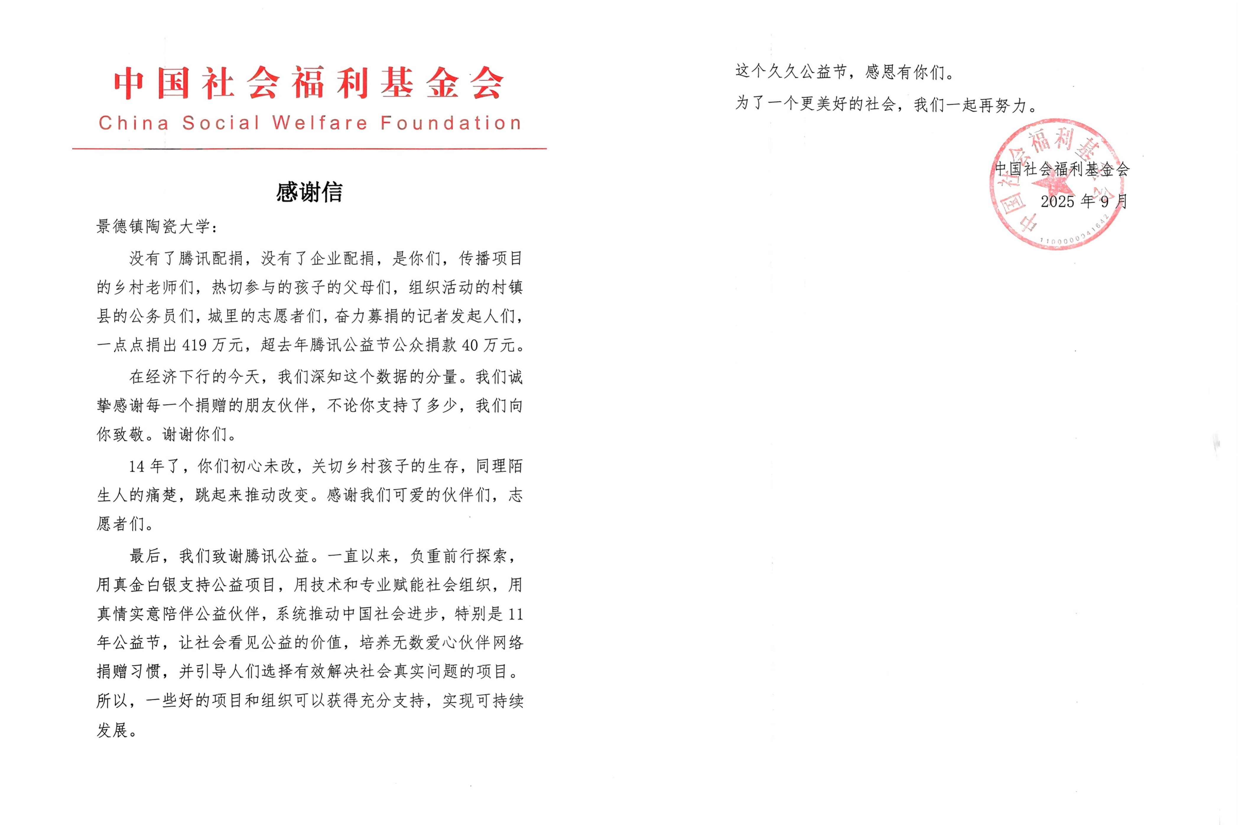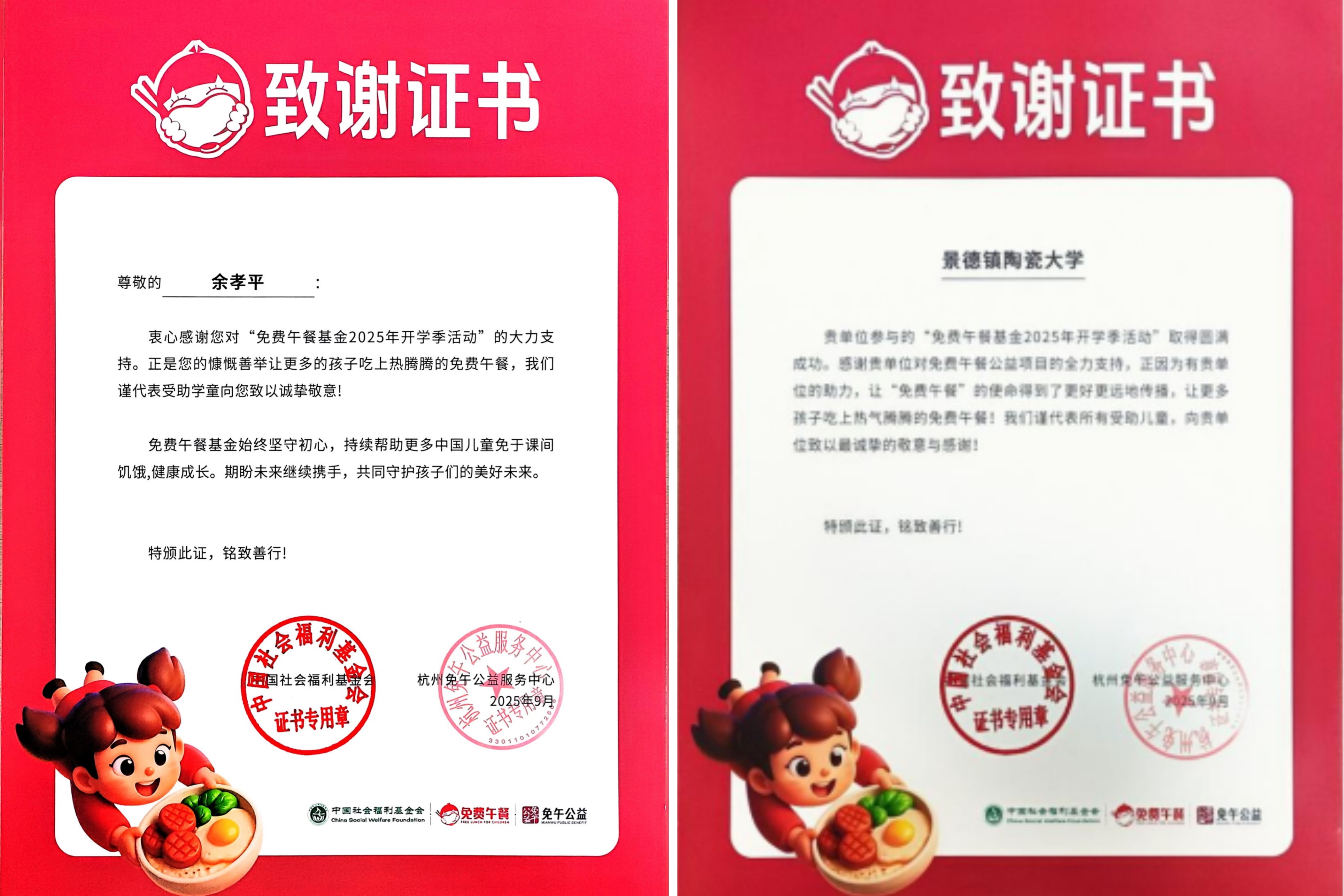本网讯(国际文化传播学院 王慧杰)近日,我校国际文化传播学院余孝平教授收到来自中国社会福利基金会免费午餐基金的感谢信与捐赠证书。信中,基金会对余孝平老师多年来持续关注乡村儿童营养健康、坚持向“免费午餐”公益项目捐款的善举表示诚挚感谢,并充分肯定其作为一名教育工作者的责任担当与大爱情怀。这份来自公益机构的认可,不仅见证了余孝平老师十余年如一日的默默坚守,更彰显了作为一名新时代高校教师立德树人、服务社会的精神底色。