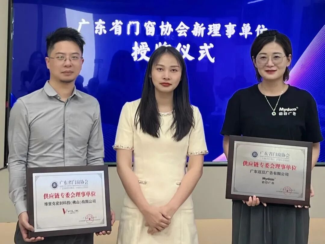同时,广东省门窗协会党支部书记彭思娜为新晋理事单位迈豆广告、维里克密封胶条授予荣誉牌匾。