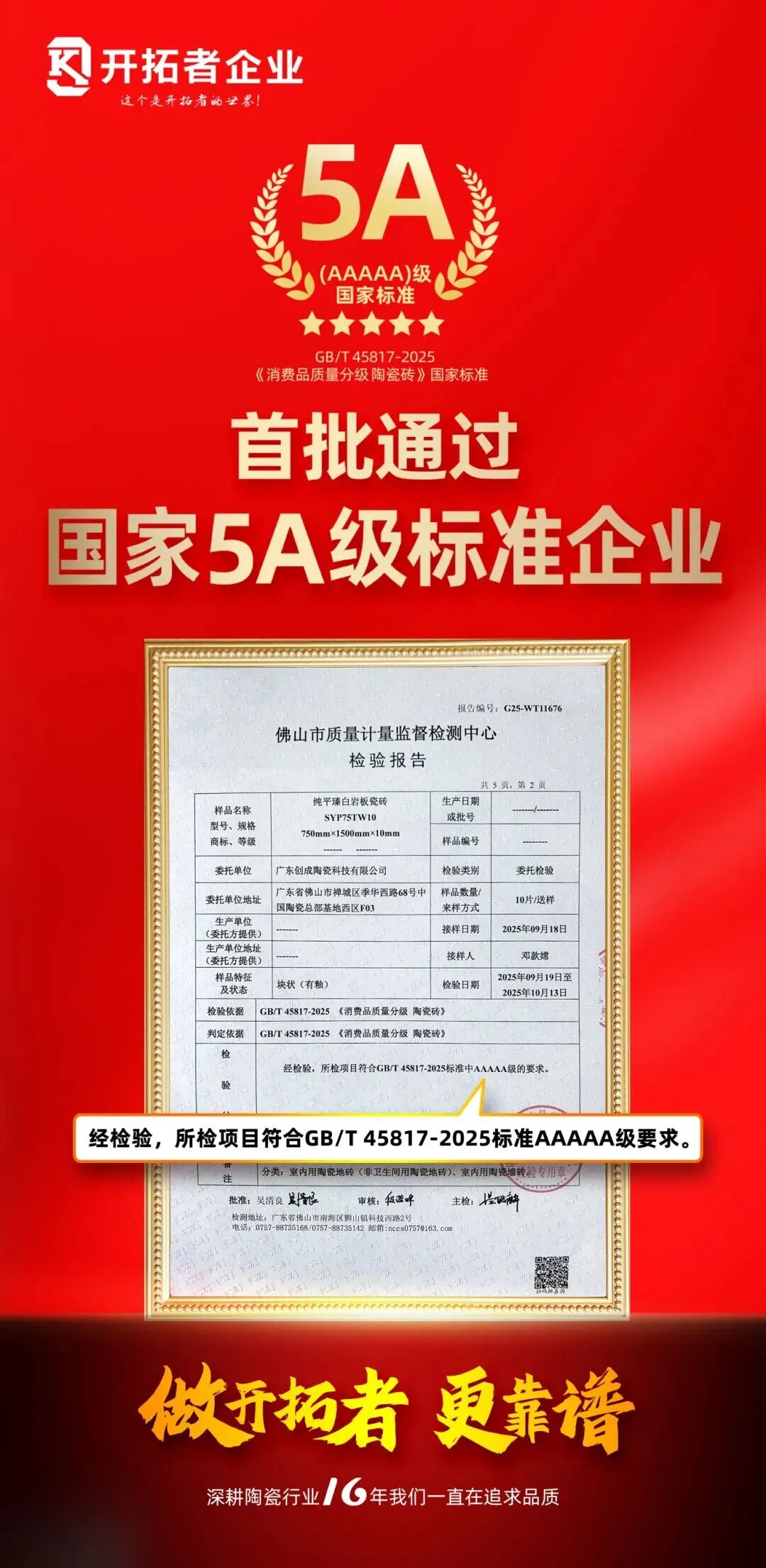 10月17日,《2025建筑陶瓷新质生产力大会》正式揭晓首批国家新标准GB/T45817-2025《消费品质量分级 陶瓷砖》的质量测评结果。作为扎根16年的纯广东制造陶企,开拓者企业首批送检的产品通过国家5A级标准检测。本次通过国家级5A标准检测,既是对品质坚守的高度认可,更是对“自我要求、自我提升、自我超越”理念的践行。