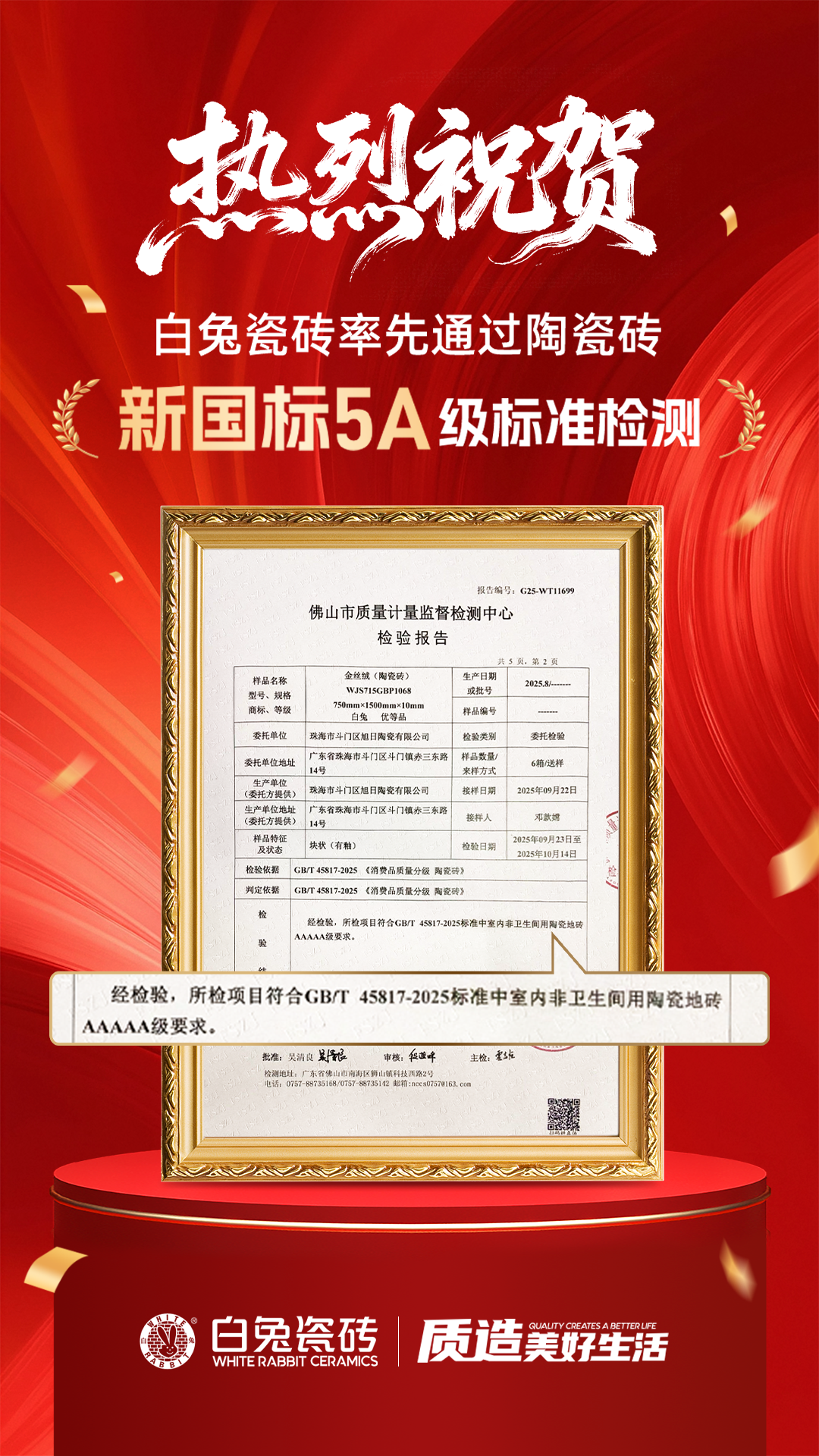 2025年,中国建材行业迎来历史性变革——《消费品质量分级 陶瓷砖》国家标准(GB/T 45817-2025)将于12月1日正式实施,标志着陶瓷砖产业迈入“质量分级、精准评价”的新纪元。在此行业转折点,白兔瓷砖送检产品经国家级权威检测机构严格测试,成功通过GB/T 45817-2025新国标认证,成为行业内首批通过新国标AAAAA级(5A级)最高质量等级认证的品牌之一,以硬核实力诠释“品质创造”的企业内核,为行业高质量发展树立标杆。