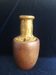 《罗汉净水瓶》,是丙申谷雨窑的作品。作品除了器型端庄、舒展、大气,更重要的是木灰釉经过多次实验釉色的满意呈现。老师说:“一件作品,没达到实验的结果,再艺术的作品都是偶然”。罗汉净水瓶在多次草木灰的釉色实验中,呈现出微矿物质在火中的曜变, 作品在釉色流淌当中,既有流淌又有聚合,而在聚合流淌之外,流淌当中釉色的变化也是堪称完美,瓶口处的釉色温润透亮,色彩由深入浅。釉色暖红如夕阳,如红叶,标志着万物的终极。釉色暖黄,如金穗,如高粱,荡漾着丰收的喜悦。而另一侧是脉络聚合的效果,好似栩栩如生的菩提落叶。