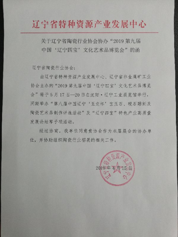 关于辽宁省陶瓷行业协会协办“2019第九届中国“辽宁四宝”文化艺术品博览会”的函