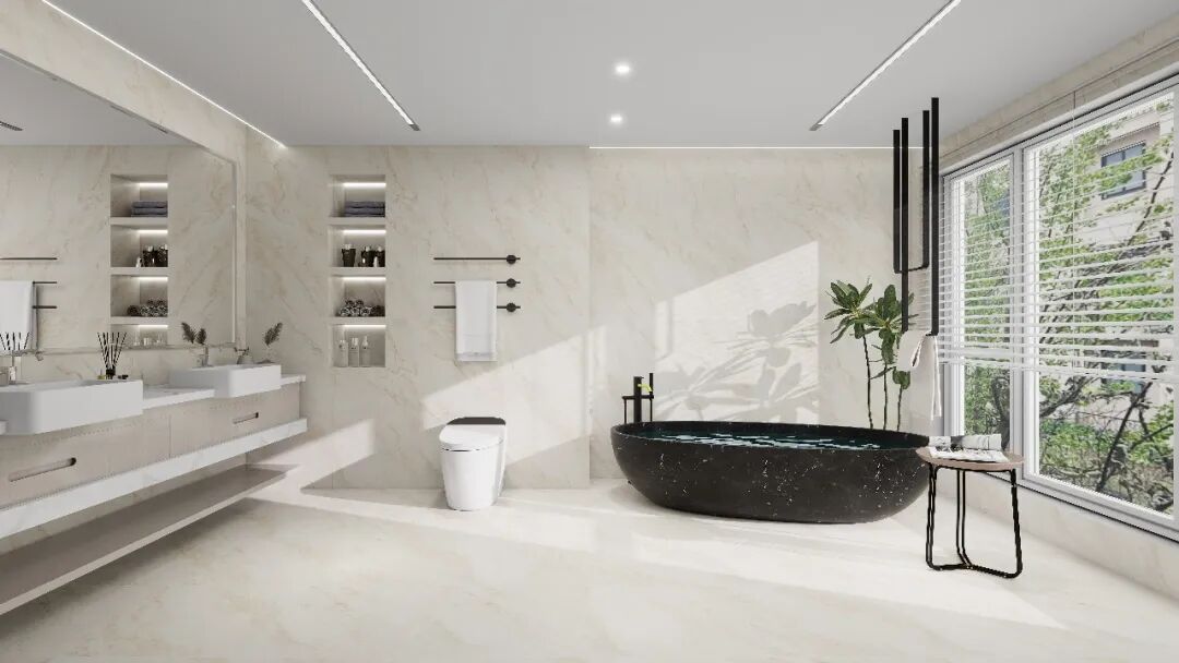 其表面采用亮哑融合设计,经蜡抛工艺呈现22-28°柔和微光,光线流转间亮而不刺眼,哑而不暗淡,营造出温润舒适的空间氛围。暖色系奢石花型的选择,更契合高阶审美,传递生活温度与归属感。