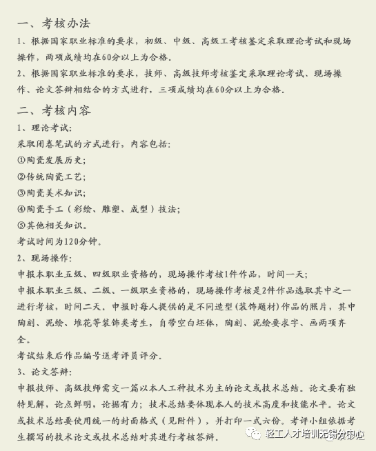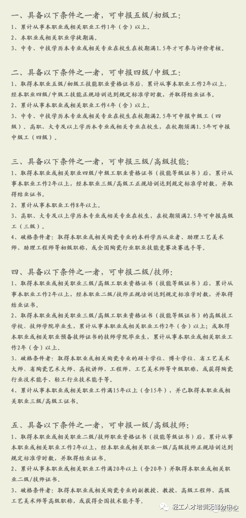 | 一、职业能力评价概述 职业能力评价证书是由中华人民共和国人力资源和社会保障部(或其他部委、全国性行业组织)备案的评价机构依据国家职业技能标准或评价规范,综合理论知识考试、技能操作考核、工作业绩评审、过程考核、竞赛选拔等多种评价方式,对劳动者(含准备就业人员)的职业技能水平进行科学规范公正评价,向合格者授予的相应职业技能等级证书。 2019年12月,国务院会议决定逐步取消水平评价类职业资格证,推行社会化职业技能等级认定,水平评价类技能人员职业资格逐步过渡到职业技能等级认定。职业能力评价证书成为职人们新的敲门砖。 二、评价基地介绍 轻工业人才交流培训中心无锡分中心是由轻工业人才交流培训中心举办,无锡市事业单位登记管理局登记的事业单位,是首批中国轻工业联合会职业能力评价直属基地,业务涵盖行业培训、职业介绍、档案托管、国际间人才交流培训等,为轻工行业培养了大量高素质技术技能人才。 轻工业人才交流培训中心无锡分中心于2023年7月7日收到中国陶瓷工业协会同意开展考评工作的批复函。陶瓷行业职业能力评价工作将主要在宜兴基地开展。 在2025年7月19日召开的2025年全国陶瓷行业职业能力评价工作会议上,轻工业人才交流培训中心无锡分中心喜获由中国陶瓷工业协会颁发的“2021~2024年度陶瓷行业职业能力评价工作先进单位”称号。 三、职业技能等级证书优势 ▷ 中国轻工业联合会颁证 ▷ 陶瓷行业劳动者能力证明参考依据 ▷ 求职、任职、从业资格凭证 ▷ 有助于学校、企事业单位评职评先 ▷ 一二级技师等同高技术人才/高工 ▷ 三级以上可申请加入无锡轻工高技能人才库,共享高端圈子俱乐部活动 四、申报条件和评价方式 1、考评工种 国家职业技能等级一般分五级:五级/初级工,四级/中级工,三级/高级工,二级/技师,一级/高级技师。 本基地可评价的工种和等级为: 陶瓷产品设计师,职业编码:4-08-08-13,1~5级 陶瓷工艺师,职业编码:4-08-08-14,1~5级 陶瓷原料准备工,职业编码:6-15-05-01,1~5级 陶瓷烧成工,职业编码:6-15-05-03,1~5级 陶瓷装饰工,职业编码:6-15-05-04,1~5级 2、申报条件 3、考评标准 |