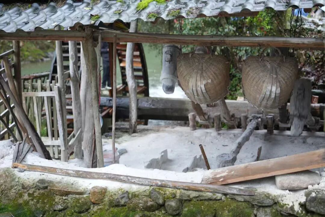 步入绕南村,远远地传来“咚咚咚”的声响。走近细看,潺潺流水驱动着水车转动,水车带动木杆,木杆上的小木片随转动卡扣住水碓的锤子,7个锤子整齐排列,重重击打瓷石与釉果。日复一日的锤击下,坚硬的釉果早已化作细腻的粉末,生动展现着水碓技艺的精巧与古人的智慧。