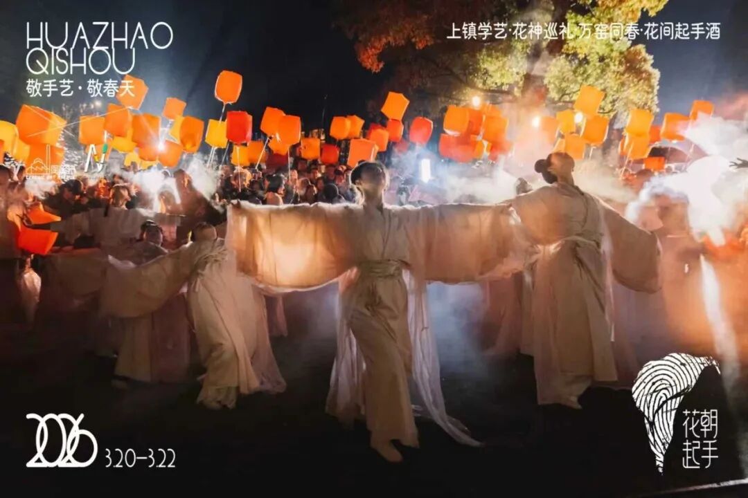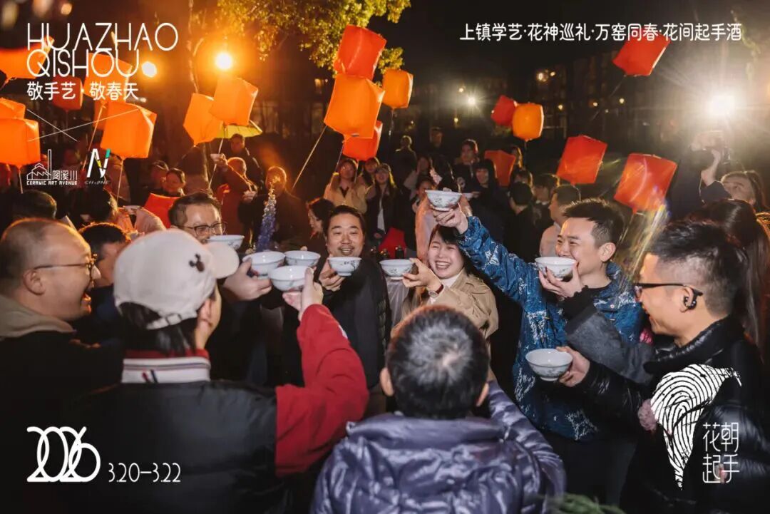 “起手·敬厚土”仪式庄重而热烈。以四季为序、十二花神为引,现场分四轮敬颂全城手艺脊梁。每一轮敬酒,全场齐喊景德镇方言号子“yo huo!起——起——起起起——起!”,浑厚的呐喊穿透雨幕,饱含着手艺人对技艺的敬畏、对新年的期盼,更是对非遗保护工作的生动践行。老匠人、非遗传承人、青年创客等群体依次受敬,在春雨与敬意中,筑牢瓷都非遗传承的精神根基,践行非遗“活态传承、多元共生”的核心理念。
