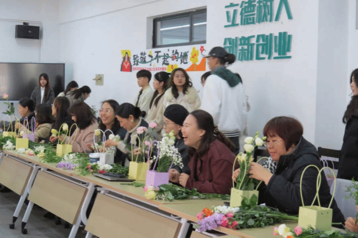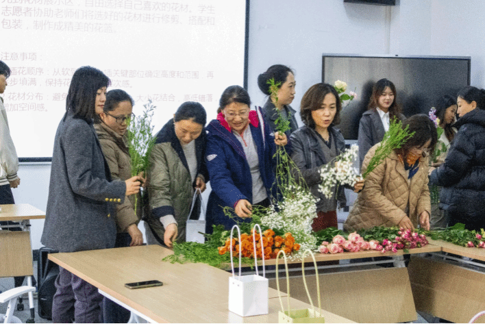 活动高潮在花香馥郁中到来。学生们化身专属花艺师,协助老师们创作春日花束。修剪绿叶花枝的沙沙声、此起彼伏的探讨声,编织成独特的节日交响。当专业老师将色彩元素融入花艺造型,巧用不同品种的花朵点睛,专业特色与节日仪式感在此完美交融。当老师们手捧着自己亲手参与制作的花束,与学生们合影留念时,那份喜悦与满足溢于言表。