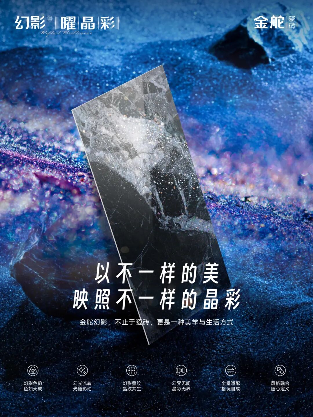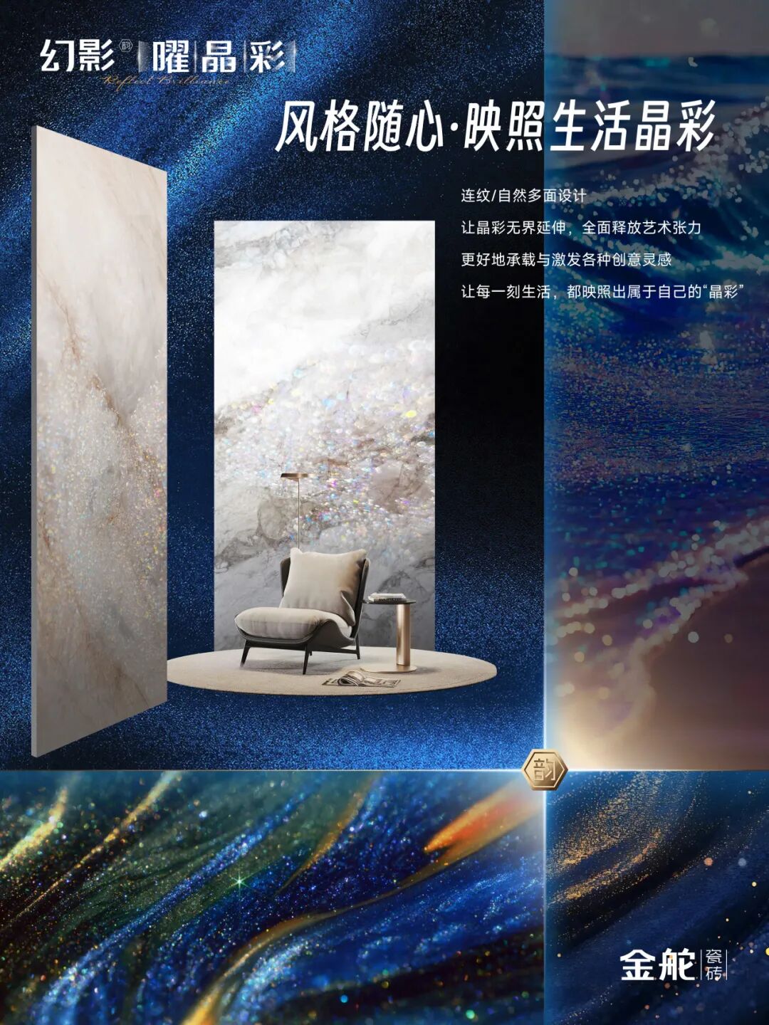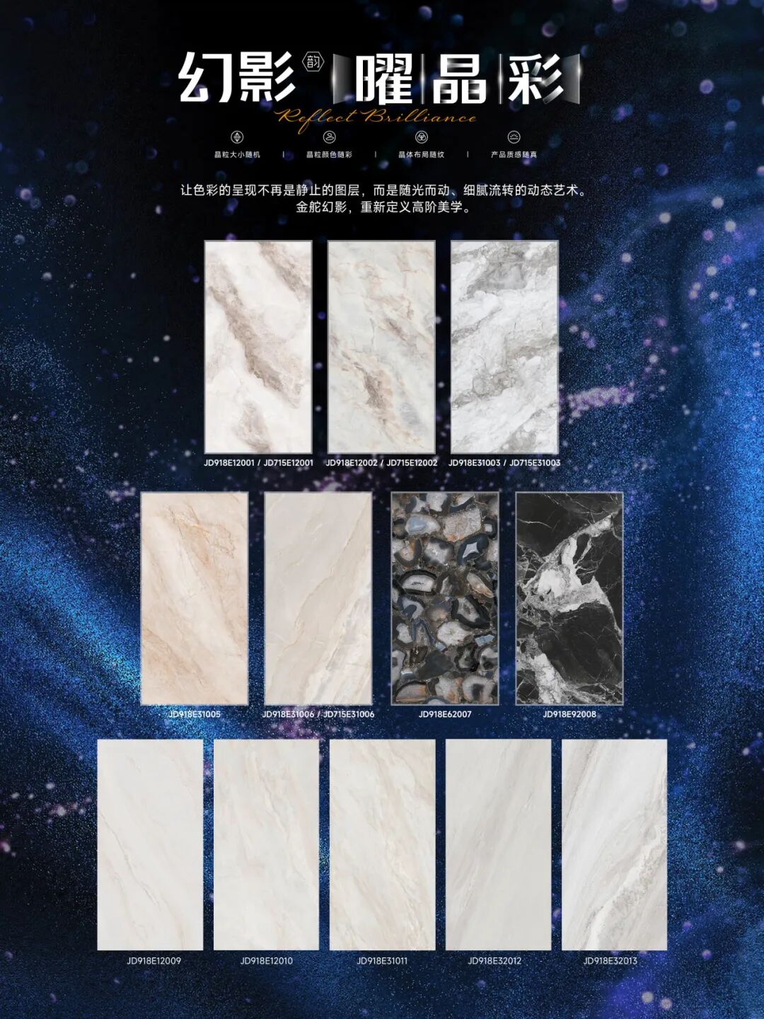 新品通过「数码彩虹晶粒」与「纯平镜面精抛技术」等前沿技术,使晶粒精准嵌入纹理脉络之中,犹如珍稀石材般七彩流光,实现了从“表现色彩”到“驾驭光影”的升华,让空间尽显高级质感和品位。