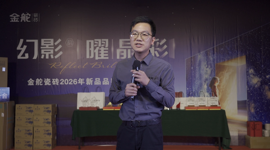 随后,品牌代表上台带来一场精彩的品牌分享。他详细介绍了金舵瓷砖的发展历程与品牌实力,同时发布了“金舵幻影”新品。
