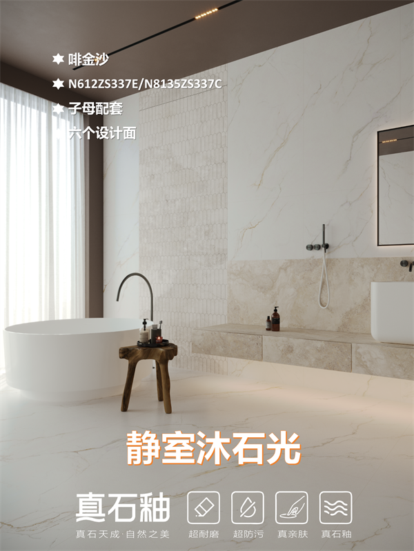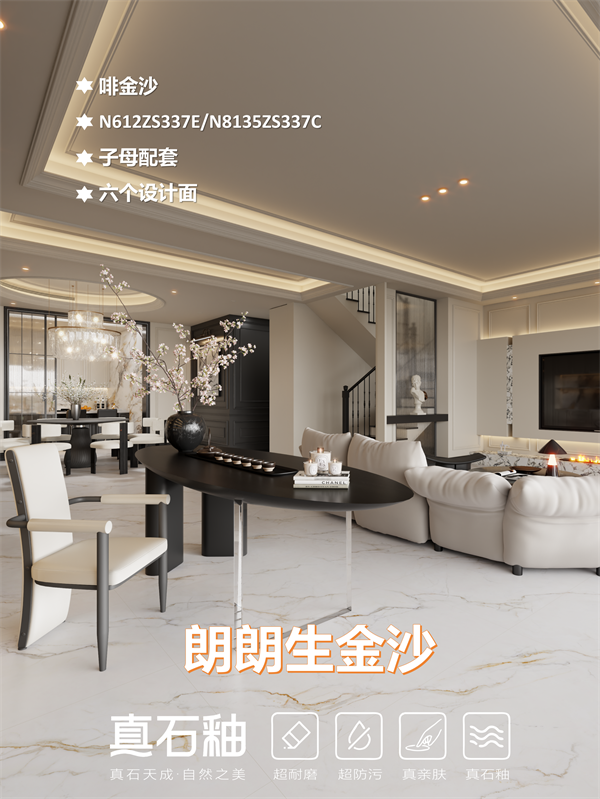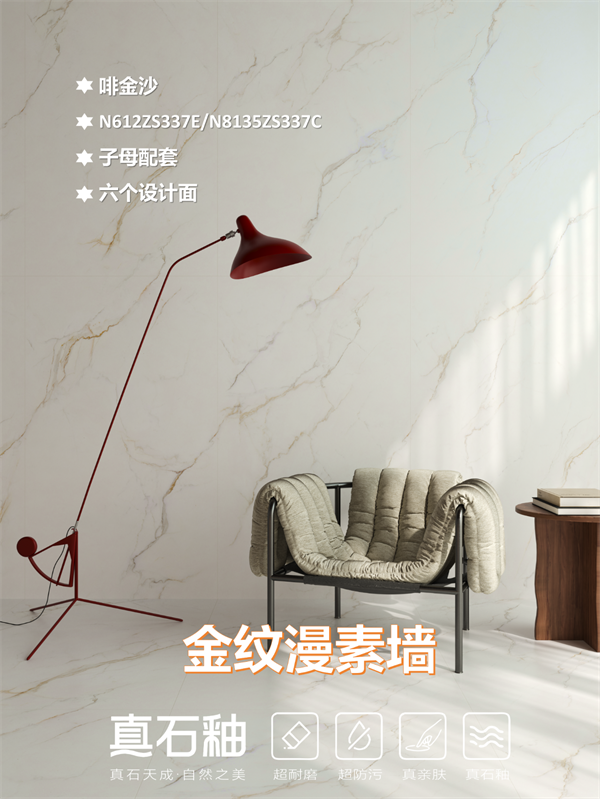 以真石为灵感,以釉面为笔触,能强真石釉系列「啡金沙」,用流动的金纹肌理,重构空间的高级感。