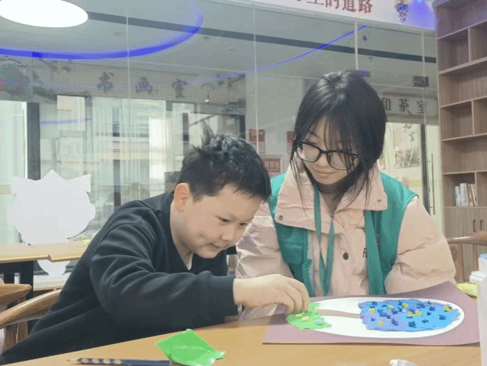 课堂上志愿者耐心地引导着孩子们们用黏土和卫生纸制作春日的树。那团团柔软的黏土在志愿者灵巧的手中,被赋予各种形状粘在卡纸上,恰似树上多样的枝叶。孩子们纷纷伸出小手跟着志愿者一起认真地制作着自己的花树,原本普通的粘土和卫生纸,被孩子们做成了各样的花朵,向人们展示着生命的柔韧。