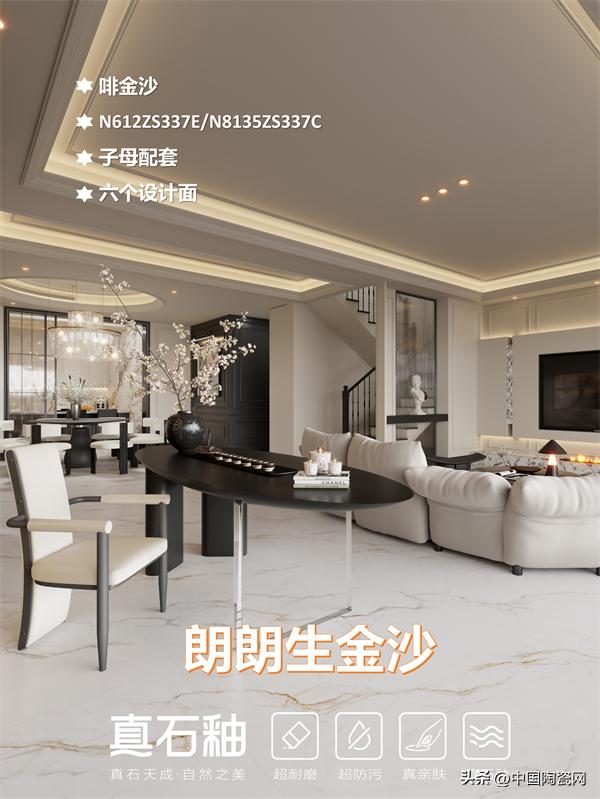 能强真石釉系列“啡金沙”,以流动的金色纹理重构空间高级感。其纹理如山川脉络般流畅灵动,配合10°-12°柔和石材光泽,还原温润的石材包浆质感。产品采用一石六面、任意连纹设计,打破铺贴局限,适配多元场景,让墙面与地面浑然天成。兼具超耐磨、超防污的硬核性能与亲肤触感,无论是客厅、餐厅还是卫浴空间,皆能轻松驾驭。在光影流转间,为家居勾勒出别致高雅、舒适自然的氛围。