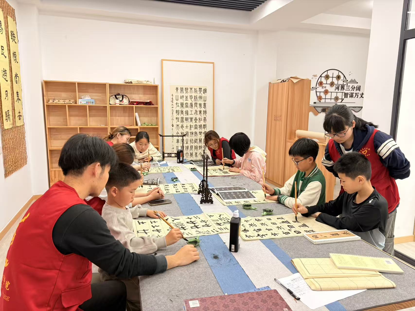 课堂上,来自中国青瓷学院的志愿者们化身指导老师,为社区青少年开展书法系统教学。志愿者们耐心每一个细节,引导孩子们在一笔一画中感受汉字的形体之美、文化之韵。孩子们端坐桌前,铺纸,运笔。志愿者们穿梭于书桌之间,逐字逐句点评指导,在互动教学中传递温暖与知识,让公益课堂成为高校学子与社区青少年双向成长的文化阵地。活动尾声,孩子们纷纷展示自己的书法作品,志愿者与孩子们共同合影,定格墨香相伴的温暖瞬间,为本次公益书法课堂画上圆满句号。