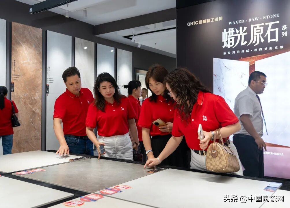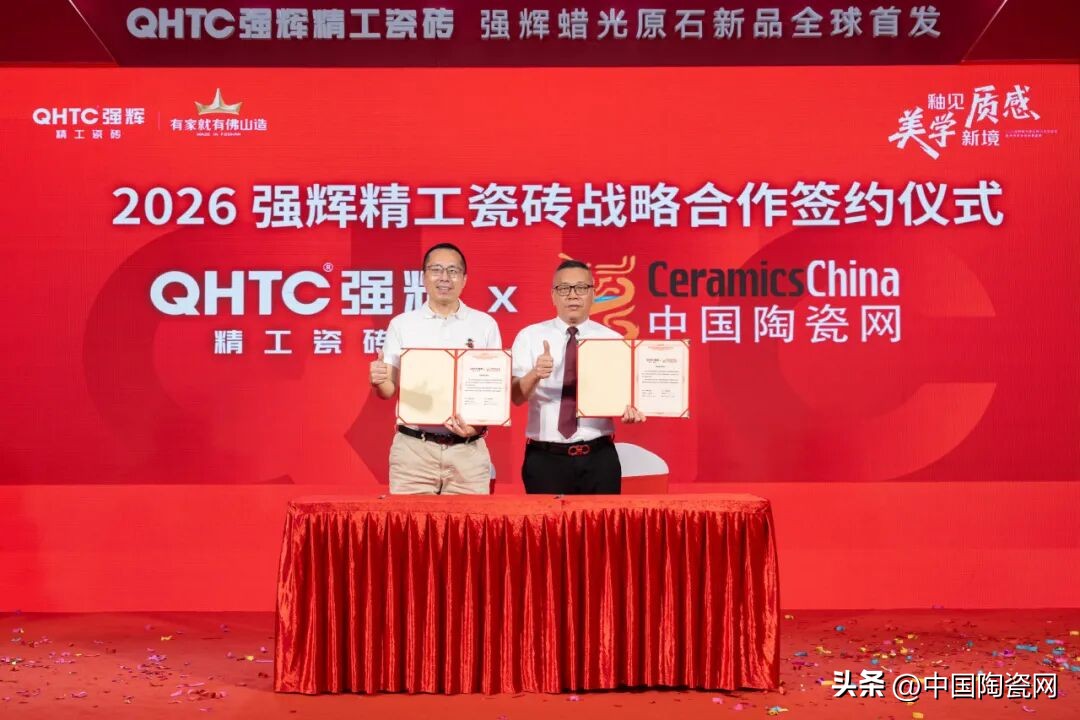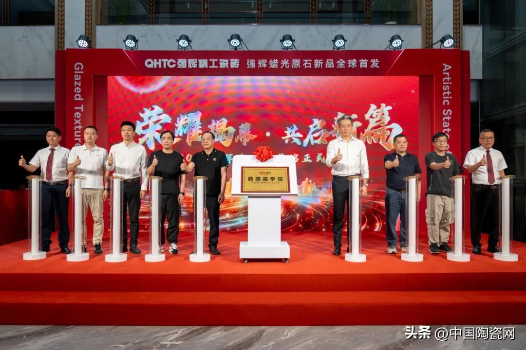 活动中,质感美学馆正式揭幕,空间融合自然纹理与现代设计,光影交织,诠释家居质感。蜡光原石系列新品全球首发,彰显品牌工艺创新与高端市场深耕的决心。强辉还与中国陶瓷网、抖音本地生活、智幻科技达成战略合作,共启发展新程。