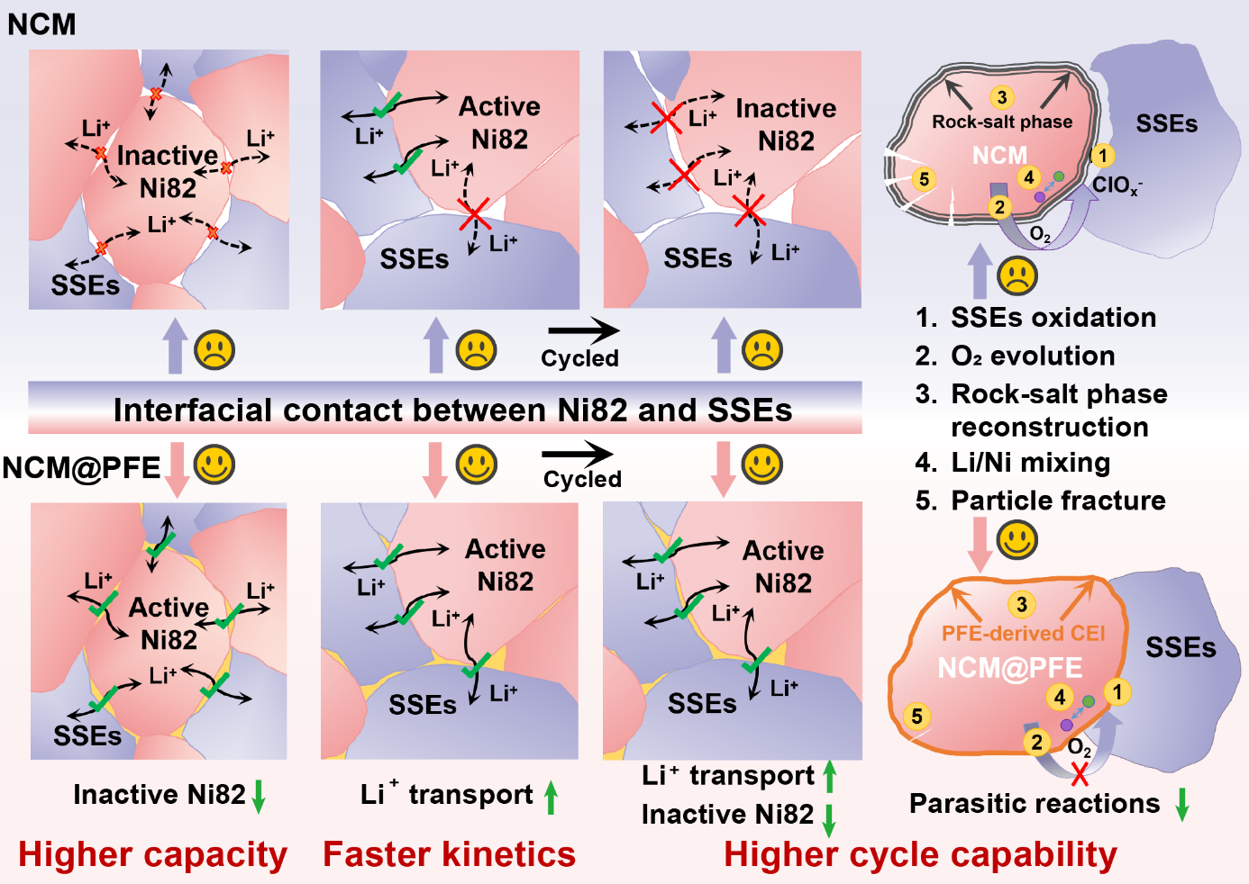 该研究首创性地提出了卤化物基固液协同复合正极的概念,开发了适配于卤化物基固态电池的液态正极成膜添加剂全氟聚醚(PFE)。在复合正极中,通过构建稳定且具备离子传导能力的正极电解质界面层(CEI),显著改善了颗粒间的界面接触和离子传输,从而显著提升了电池的容量发挥、倍率性能及循环稳定性;首次系统评估了卤化物电解质与液态有机成膜添加剂的化学兼容性,成功设计并筛选出有效的成膜添加剂,为卤化物基全固态电池的界面改善策略提供了全新思路,具有较高的学术和商业化应用价值。
