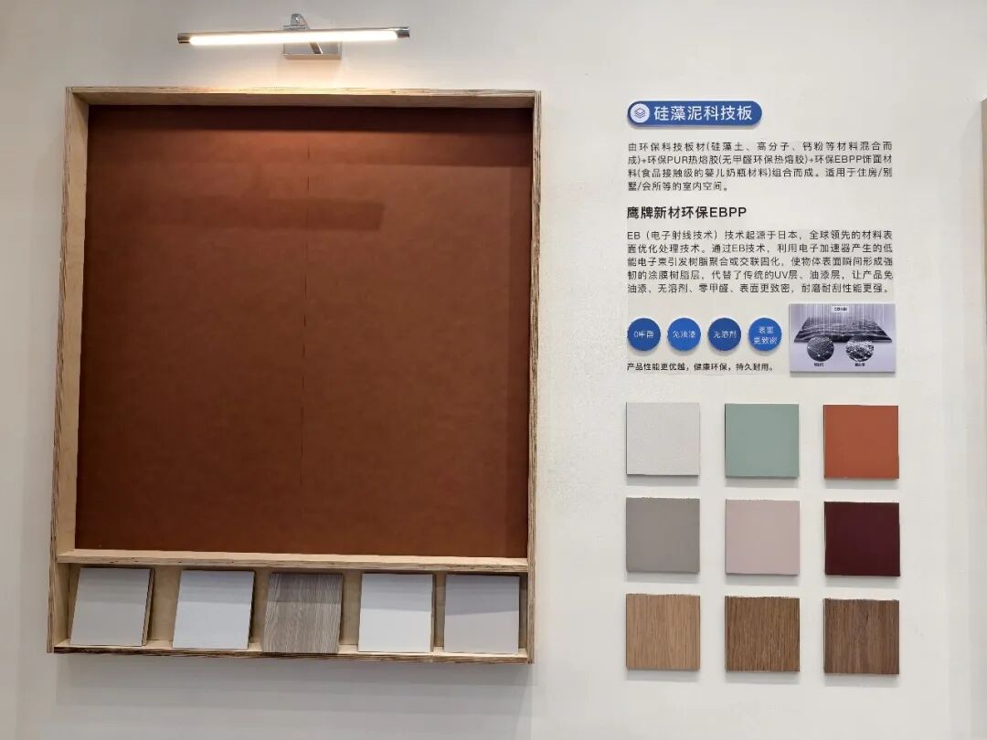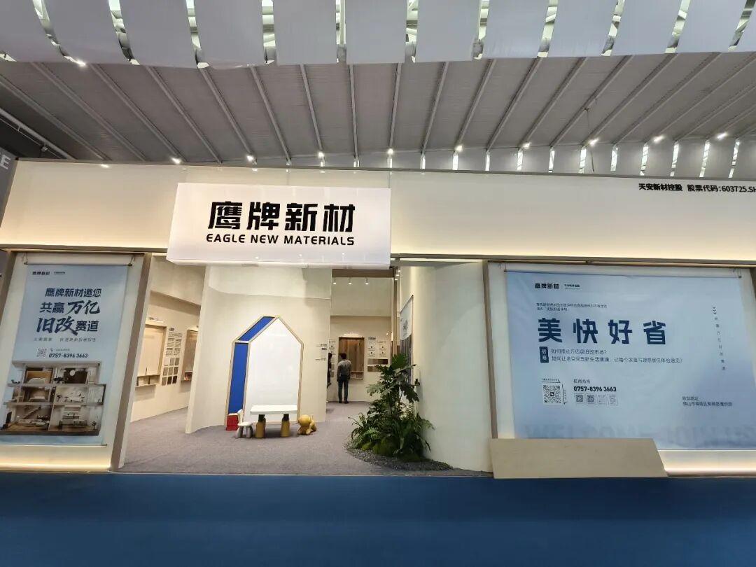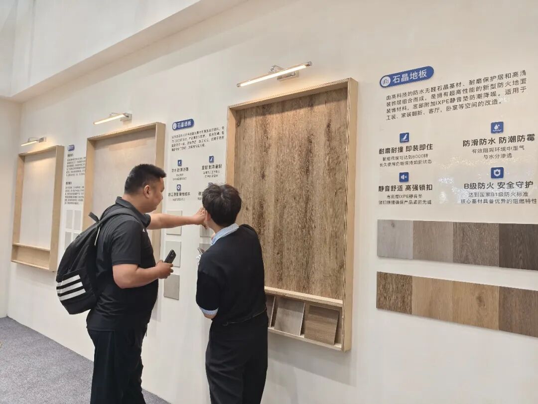 此次展会,鹰牌新材展示了其核心产品,涵盖硅藻科技墙板、安芯墙板、石晶地板、石晶墙板、防滑地胶等,具有环保、防潮、防火、耐磨等特性,适用于旧房翻新、公区改造等场景。