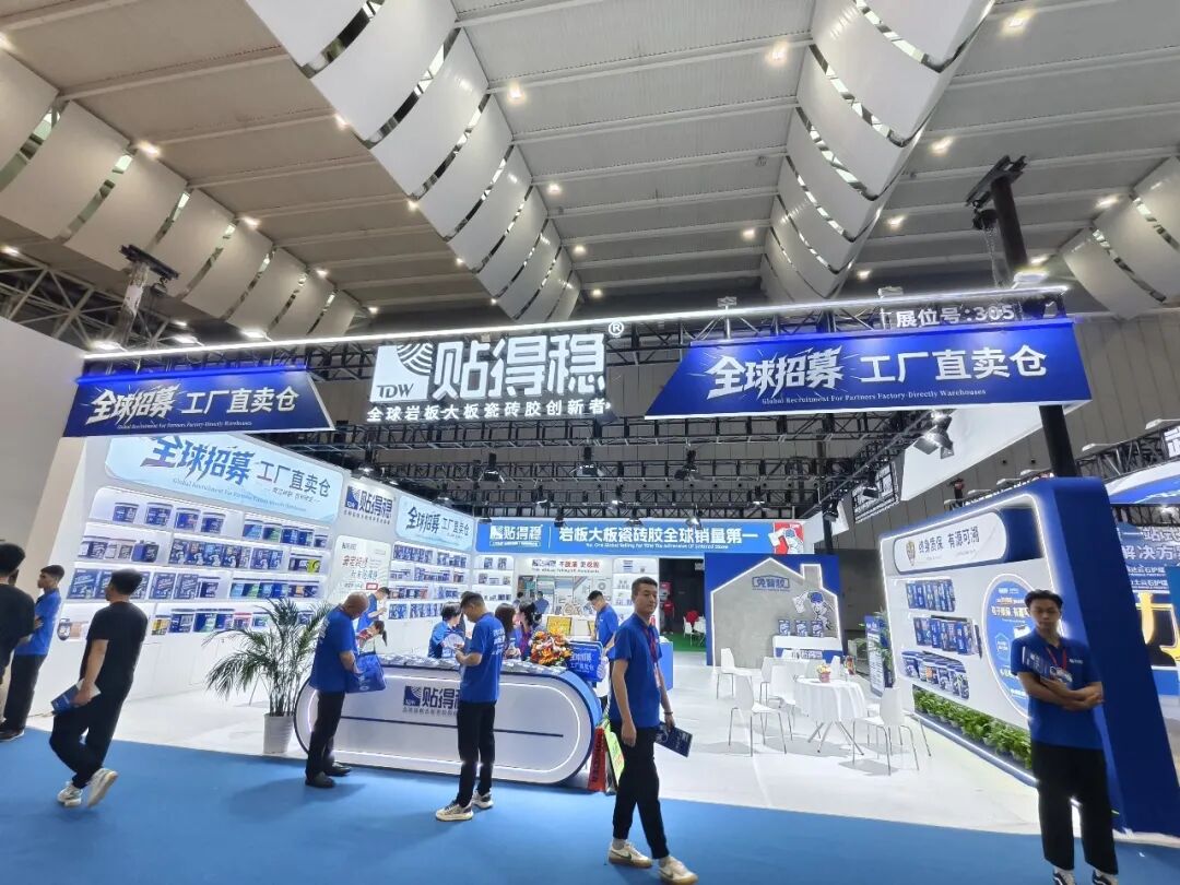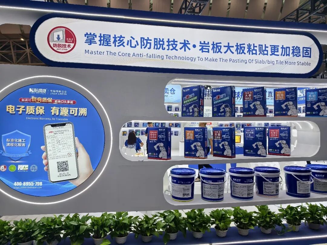 作为岩板大板瓷砖胶全球领导者,贴得稳此次展会主要展示防脱落核心技术、高碳纤维系列新品及全链条赋能体系。