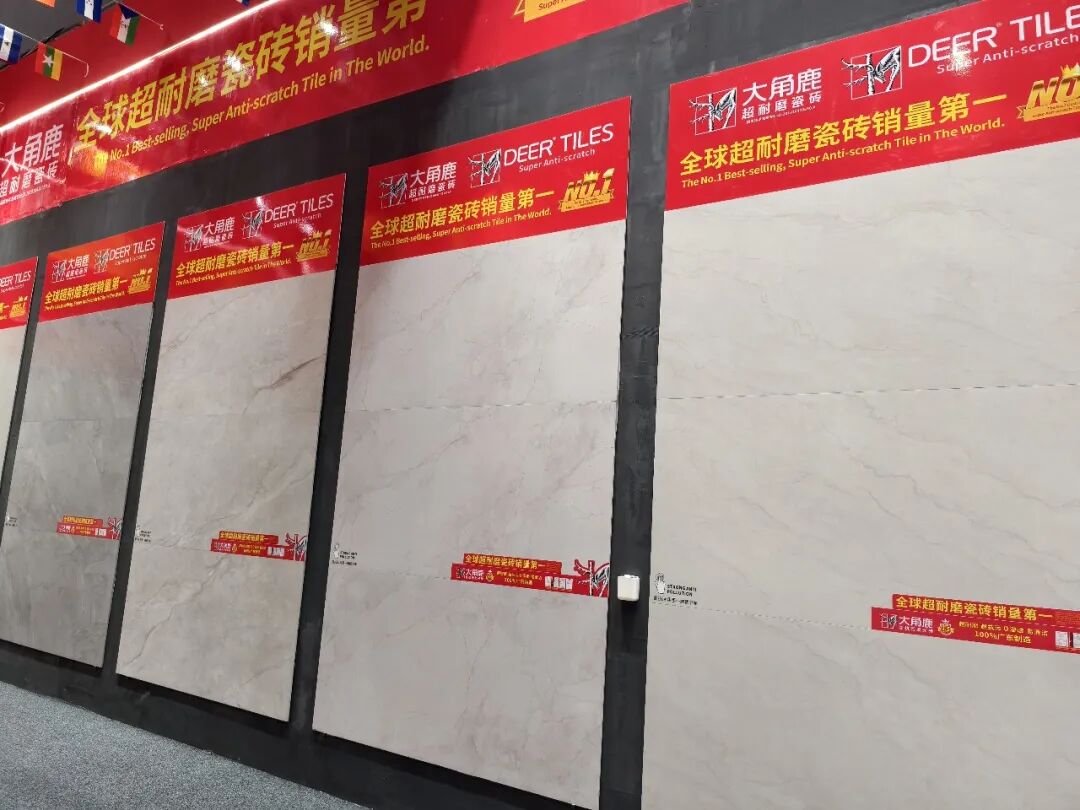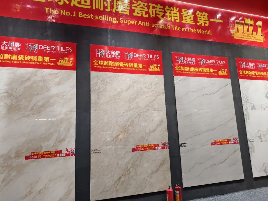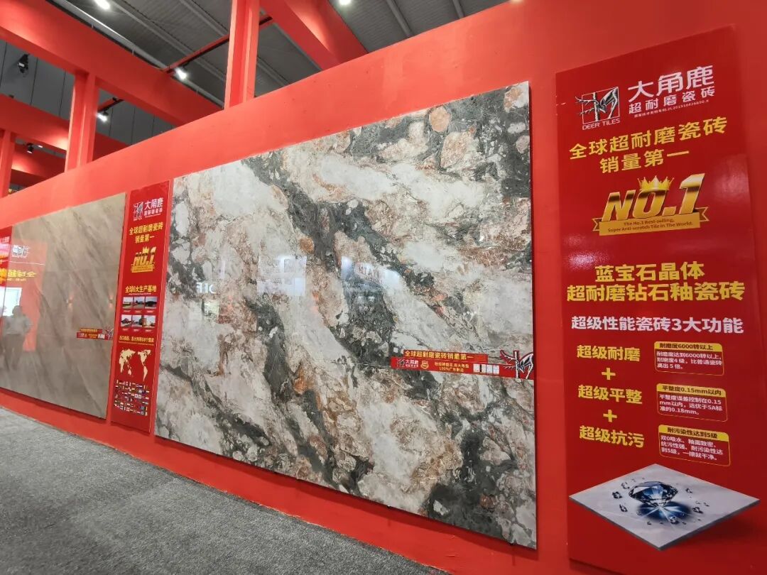 展位外立面,“全球超耐磨瓷砖销量第一”“工厂直卖仓 多快好省”的标识异常醒目。此次展会期间,大角鹿继续举办超耐磨万人PK大赛,吸引众多观众踊跃参加。
