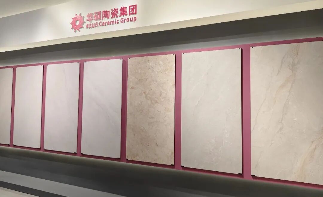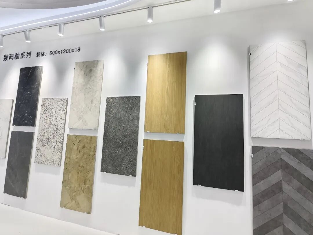 华硕主要展示了5A超洁金丝绒(白坯)系列和数码木纹家Ⅱ系列产品。5A超洁金丝绒采用45°超白底坯,将金丝绒的细腻温润与石材通透感结合,并坚守严苛5A级防污标准,具备超强防污、耐磨性能。数码木纹家Ⅱ则通过高精度数码模具及多重工艺,深度还原天然木材肌理,具备双零吸水率,耐磨抗造,花色选择多样。