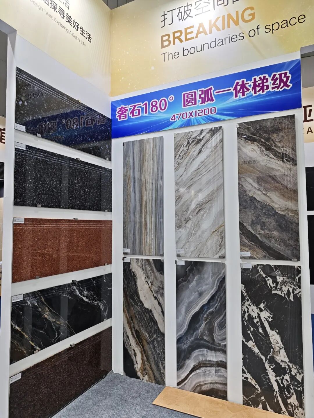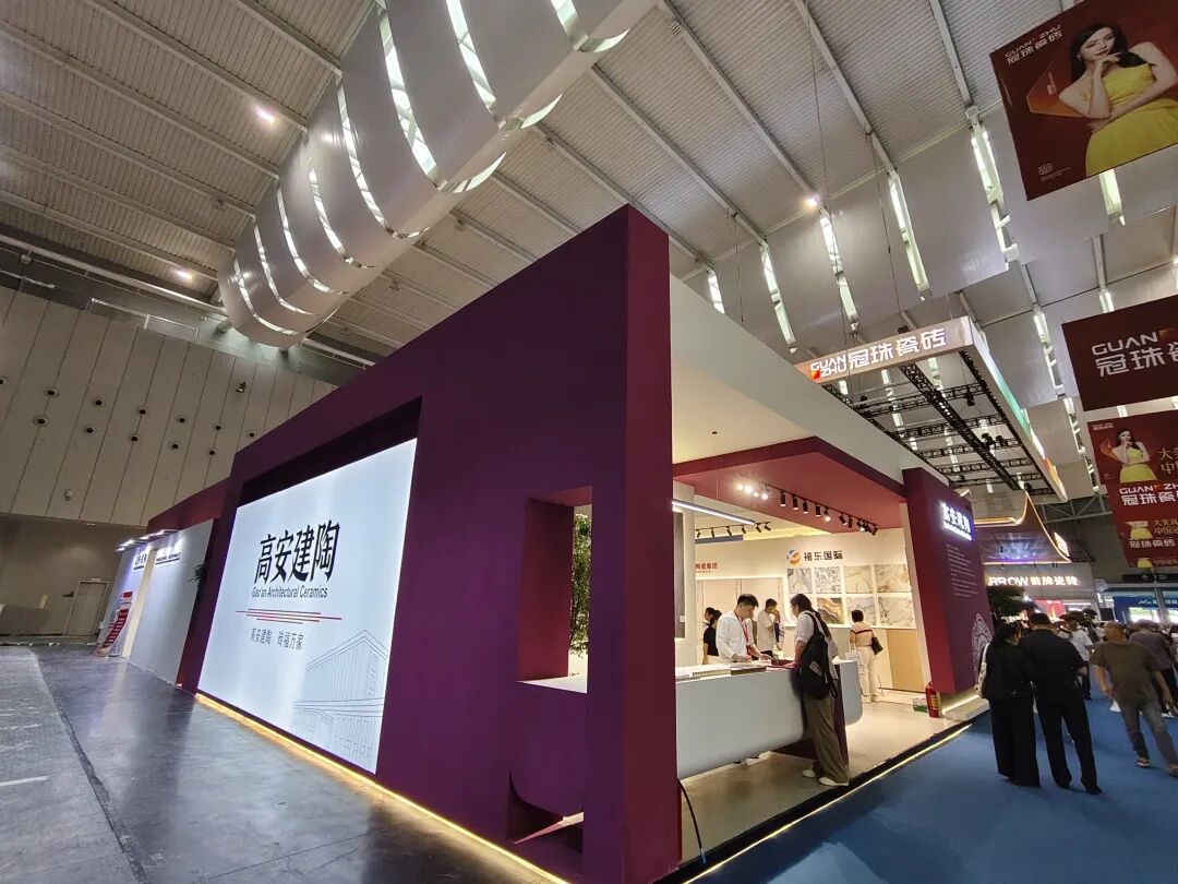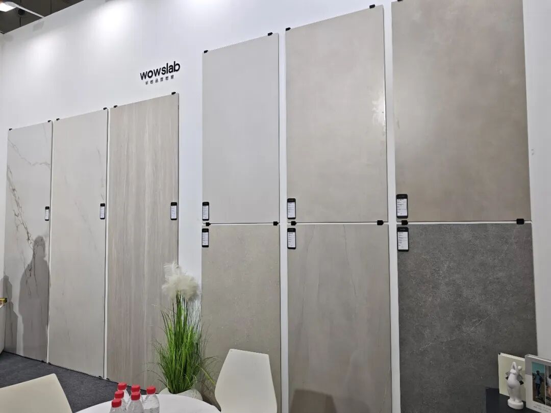 这是浩锐首次参加佛山潭洲陶瓷展,现场展示其全规格陶瓷产品,包括别墅外墙砖、金丝绒、木纹砖、超平釉、超防污子母配套大理石等新品。