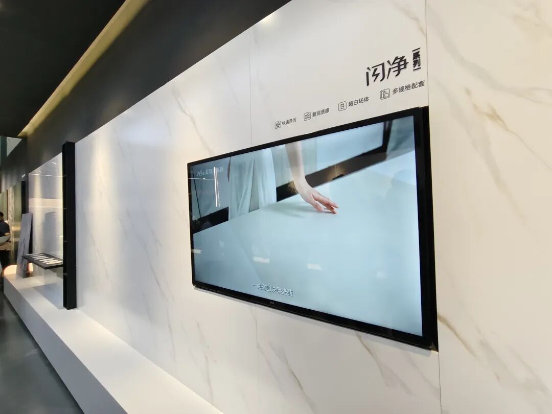 闪净系列以“一擦即净”为核心理念,采用柔光晶护技术与50°超白岩板级基材,通过纳米防污粒子植入技术解决柔光砖易渗污的痛点。