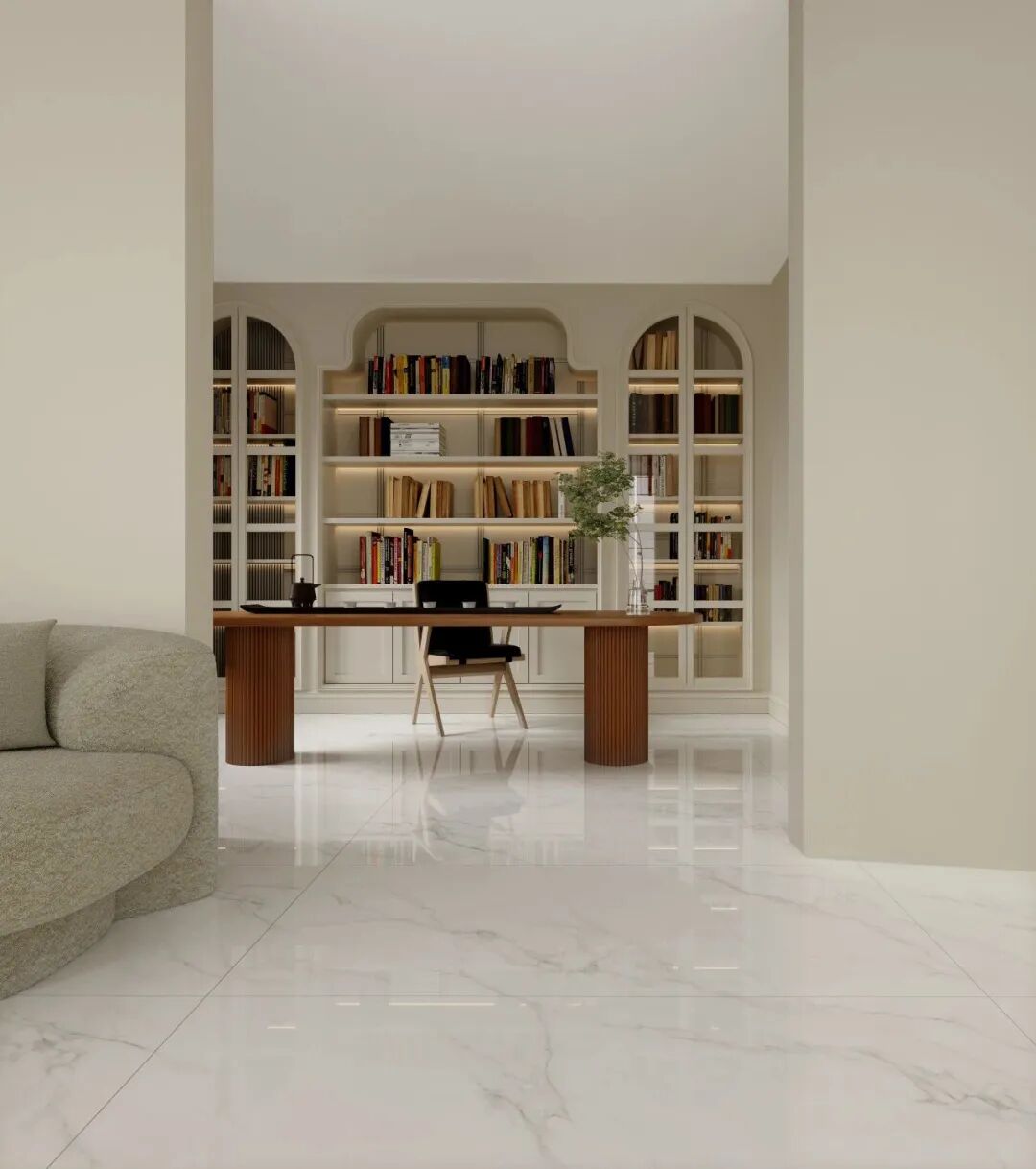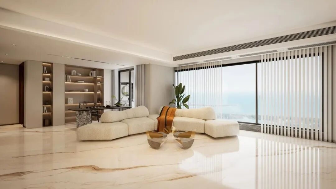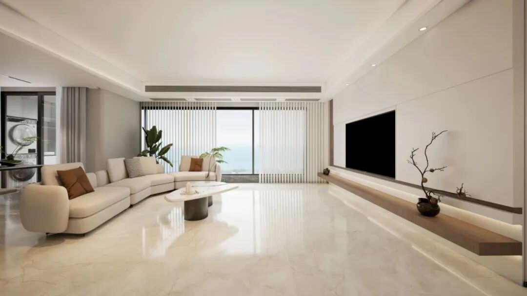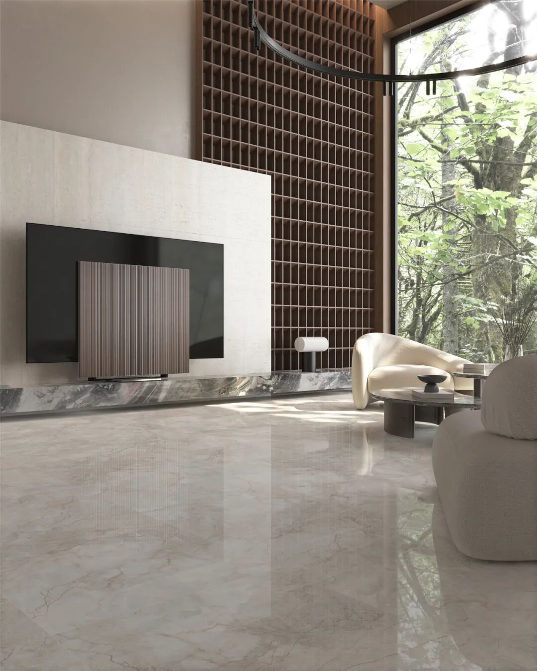 从颜值维度看,玉质石的花纹立体感来自纹理的内生性,而非简单的表面印刷。其温润通透的光感,搭配大规格密缝铺贴与纹理连贯延伸设计,进一步拉伸视觉尺度,使中小户型更显开阔、大宅更具气场。