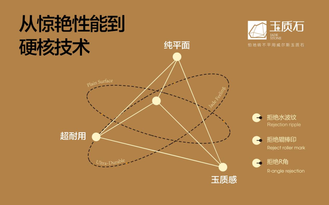 三是玉质感:温润如玉,具备“美学+健康”双重价值。玉质石运用人因护眼技术,将基于医学的方案转化为釉面护眼技术,实现了“温润如玉,触手生温”的感官。其光线折射率介于亮光砖的刺眼与哑光砖的沉闷之间,在二者之间找到了最佳平衡点,既保持了空间的明亮感,是家居美学的重要载体,又消除了光污染对眼睛的刺激,是健康生活的技术承诺,从而拥有“美学+健康”双重价值。