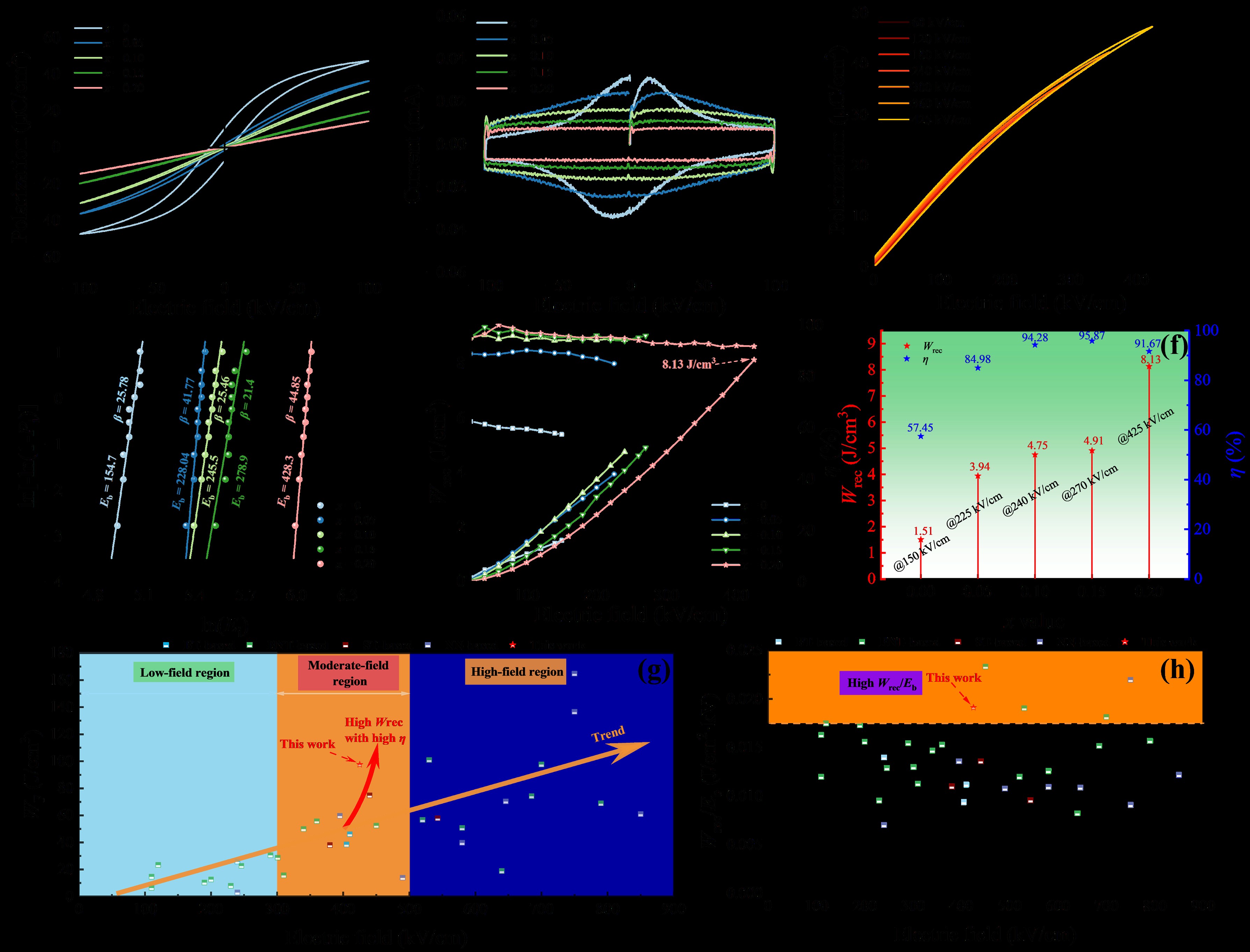 电介质陶瓷电容器具有高功率密度和快充放电速率等显著优点,在大功率和脉冲功率系统中作用关键,被广泛应用于通讯、新能源汽车及脉冲电磁能装备等领域。目前,开发兼具高可回收储能密度(Wrec)和高储能效率(ƞ)、环保、小型轻质的陶瓷电容器成为重要研究方向。高熵策略是常用于提升陶瓷电容器储能性能的方法,可以通过打破长程有序铁电畴,进而形成极性纳米微区来降低剩余极化强度。虽然通过该方法已在高电场强度下实现了陶瓷电容器Wrec的有效提升,但超高电场应用环境对陶瓷电容器的长期服役稳定性带来挑战。此外,这种方法常以牺牲饱和极化强度来降低剩余极化强度并提高击穿场强,这对陶瓷电容器在中等电场下的工业集成化实际应用造成限制。尽管目前对于研究高储能密度陶瓷电容器已经有了大量具有代表性的工作,但对于如何设计出在中等电场下仍具有高Wrec与高ƞ的新材料,仍缺乏相关科学依据。