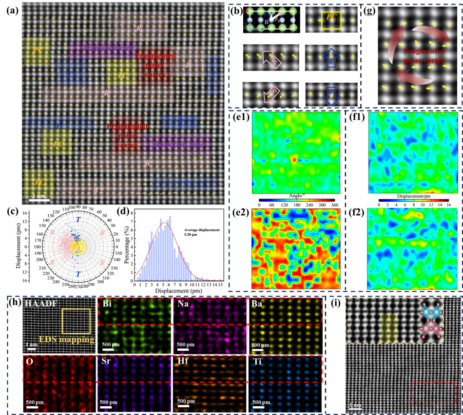 图2a) BNBST-0.20SH陶瓷的局部极化结构,包括原子分辨率的HAADF图像以及沿[110]c方向的B位点阳离子位移矢量。b)基于STEM-HAADF的B位点阳离子在[110]c方向上的矢量叠加,以及邻近阳离子在不同方向上的位移情况。c) B位点阳离子位移极化投影图;d) BNBST-0.20SH陶瓷的极化幅度分布图。e1) B位点阳离子的极化角映射图;e2) A位点阳离子的极化角映射图。f1) B位点阳离子的极化幅度映射图;f2) A位点阳离子的极化幅度映射图。g) (a)图中标记区域(红色区域)的放大视图,显示了类似碎片化极性涡旋的畴结构。h) HAADF模式下所有元素的EDS谱图。i) [110]c方向明场的STEM-ABF图,插图显示了红色区域的放大视图以及八面体倾斜。