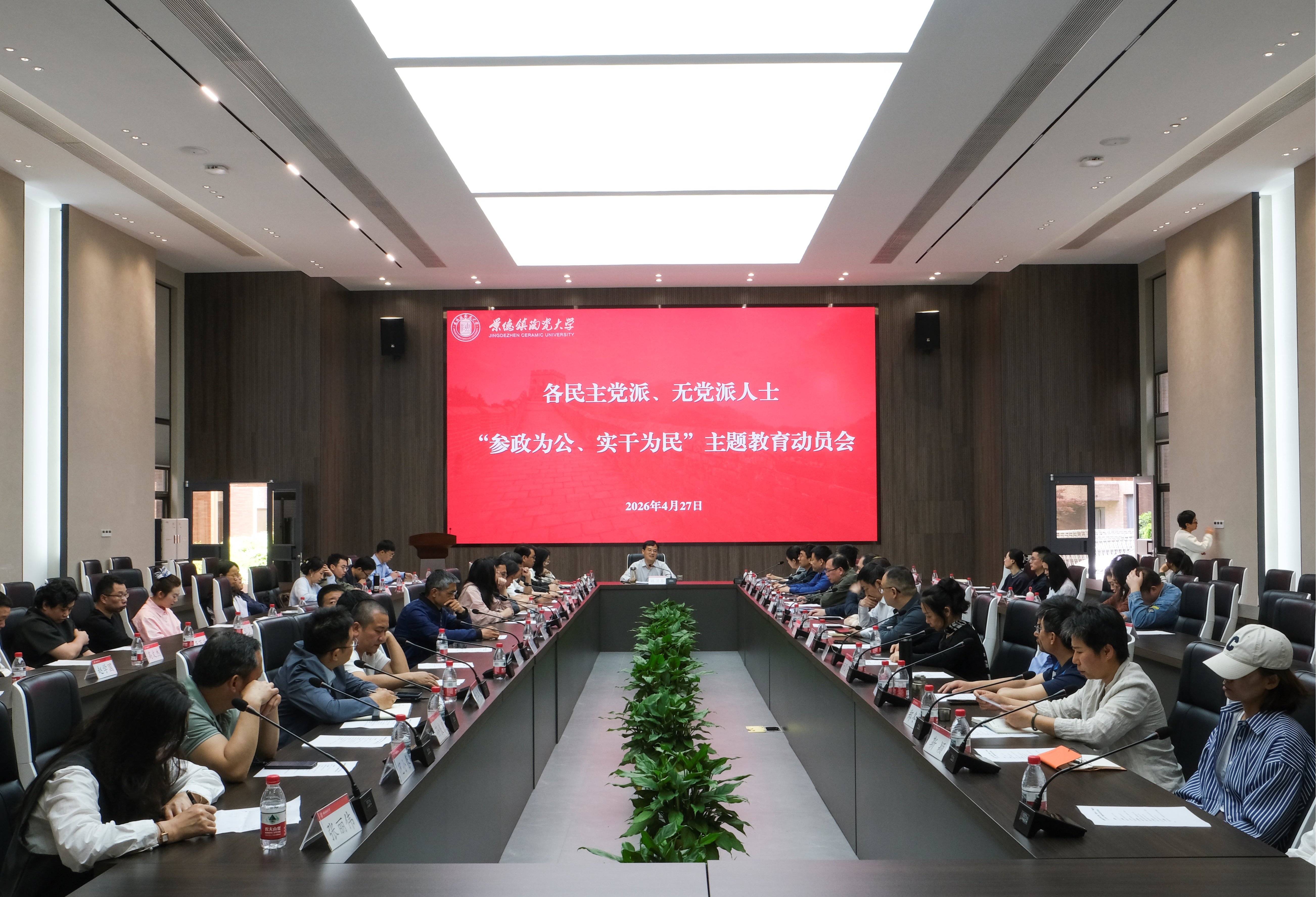 本网讯(党委统战部 宋蒙蒙)4月27日,我校在综合会议厅召开各民主党派、无党派人士“参政为公、实干为民”主题教育动员会。景德镇市委常委、市委统战部部长林卫春应邀作专题辅导报告,景德镇市委统战部常务副部长严培随同参加。会议由校党委常委、党委统战部部长陈丽萍主持,学校各民主党派支部(支社)、统战社团负责人及成员代表、无党派人士代表50余人参加会议。