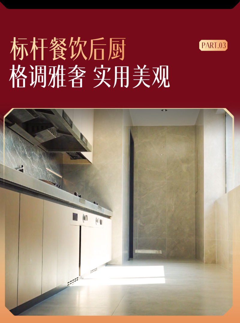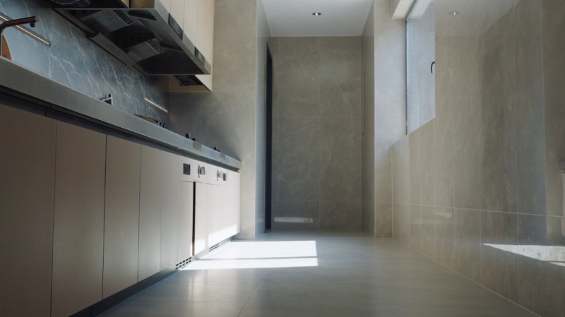 在标杆级餐饮后厨,选用冠珠普佩斯灰、静岚石云上两款灰色系产品,打造墙地统一的视觉界面。同时,瓷砖表面致密防污、耐腐蚀,适配后厨严苛的使用需求,兼具耐用、易清洁的优势,真正实现美观与实用结合。