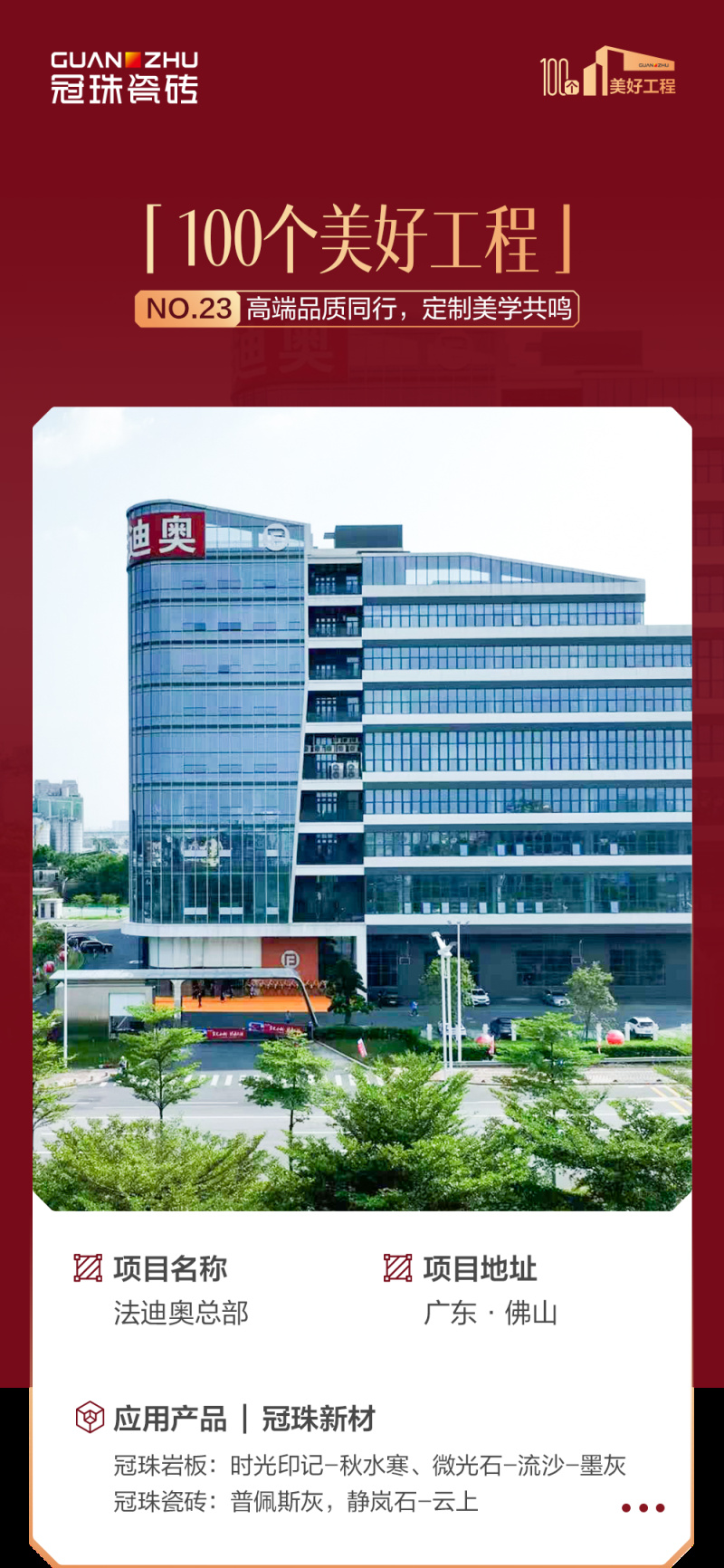 这一卓越品牌形象的呈现,离不开冠珠瓷砖“墙地台全案应用”整体空间解决方案的系统赋能。遵循空间匹配、性能适配的核心原则,冠珠瓷砖以一体化设计升华品牌美学,用材料与工艺保障质感,凭出色交付实现空间价值,为法迪奥总部串联起独特的形象气场。