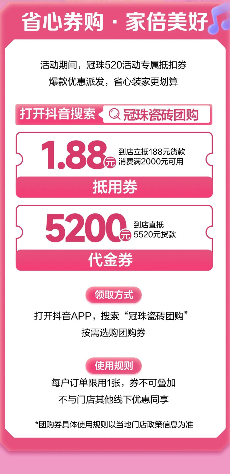 冠珠520爱家日火热开启!抖音团购券派发、颜值岩板买10送1,为爱筑家优惠选购
