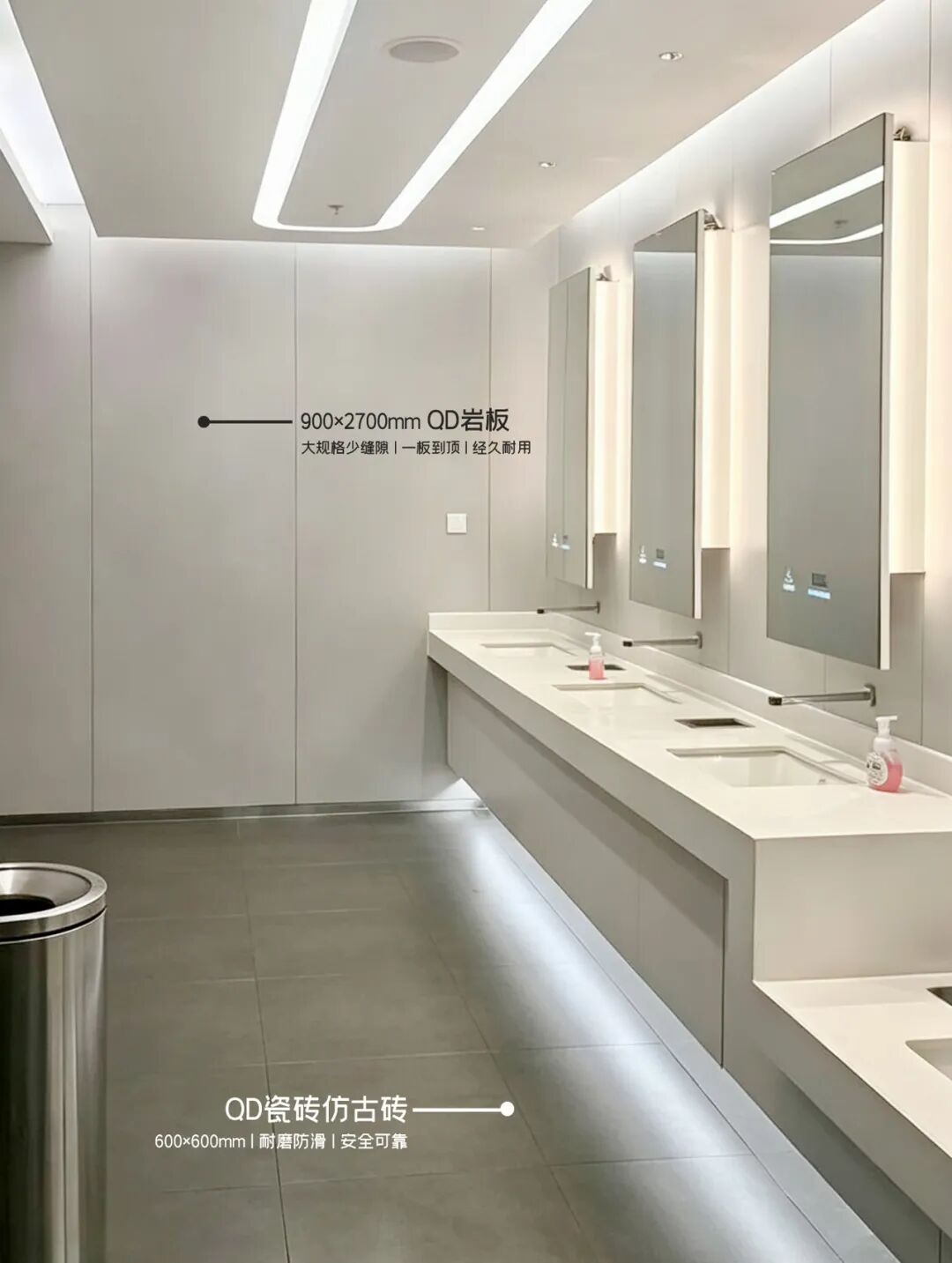 航站楼卫生间作为高频使用区域,对墙面材料的抗污、防潮、易清洁、耐冲击要求极高。项目选用QD 瓷砖900×2700mm规格岩板,以大尺寸规格实现少缝铺贴,视觉上简洁大气,更有效减少污渍藏匿;同时,岩板的防潮、防霉、抗污及耐酸碱特性,完美适配卫生间潮湿环境,长久保持墙面洁净如新,为机场空间的安全与卫生提供可靠保障。