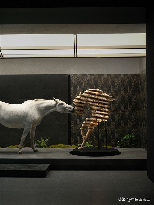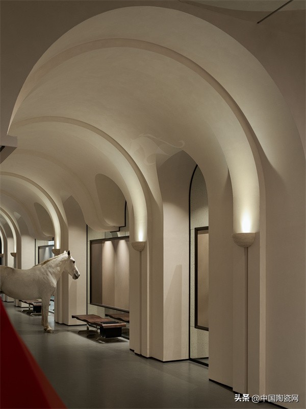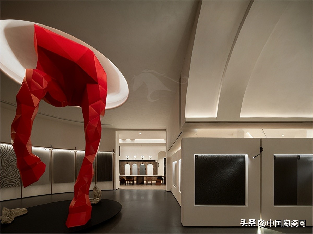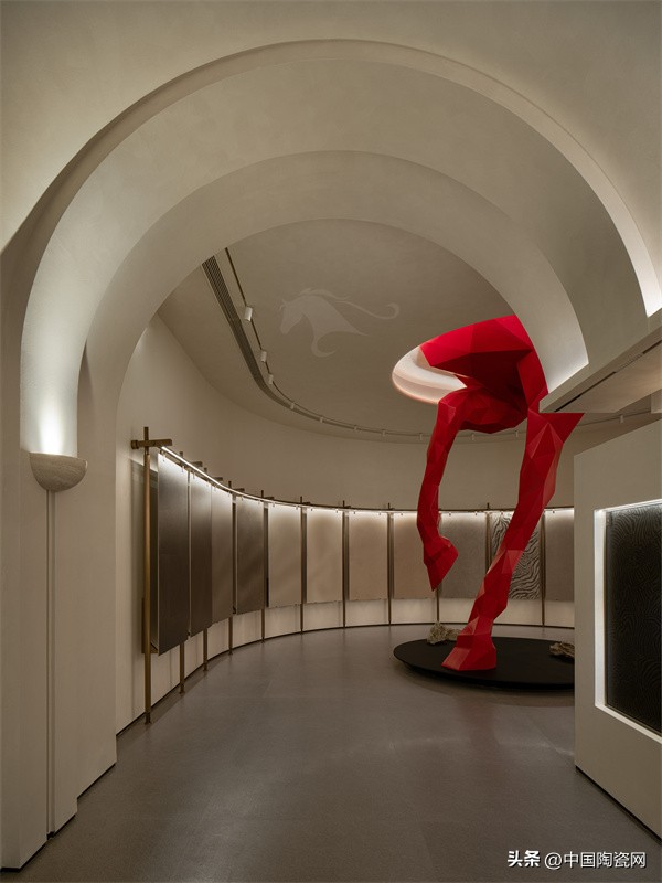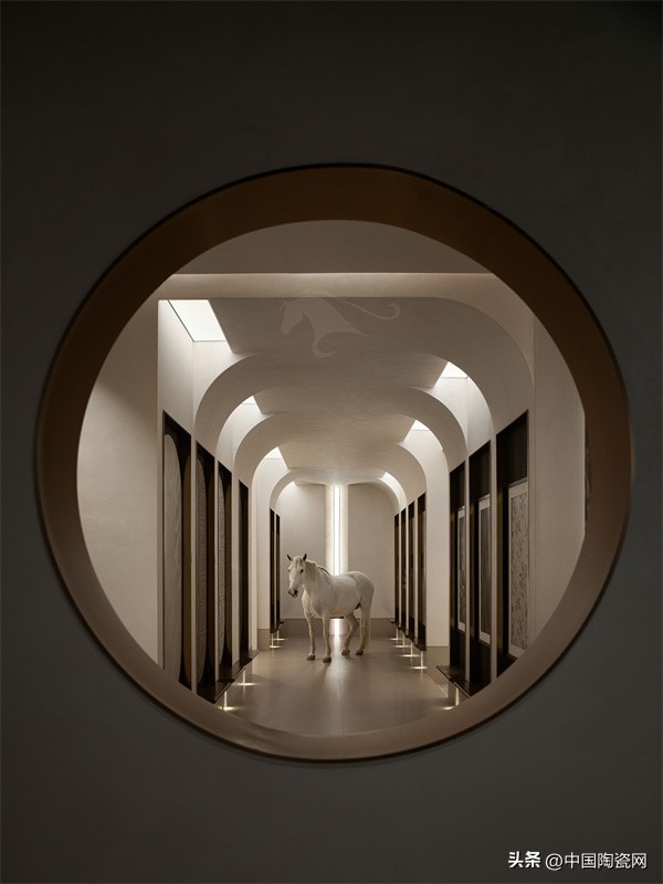 入口长廊以连续拱券营造韵律,加厚墙体嵌入产品,射灯聚焦肌理,宛如艺术藏品。统一展框弱化商业感,强化“瓷砖即艺术藏品”的调性。纯白骏马雕塑与红色马蹄装置一静一动,诠释品牌纯粹、昂扬的内核。