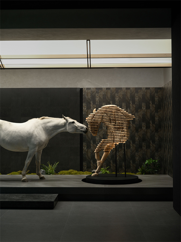 空间软装与艺术装置更是点睛之笔,纯白骏马艺术雕塑静立空间一隅,诠释纯粹、高级、诗意的品牌气质;核心区域红色奔腾马蹄装置动感十足,一静一动相互呼应,刚柔并济之间,诠释玛缇昂扬向上、坚守原创的品牌内核。