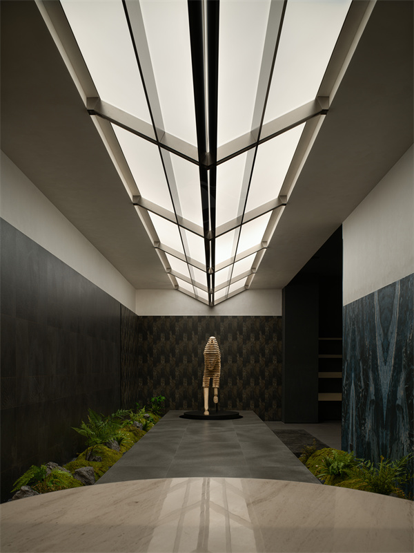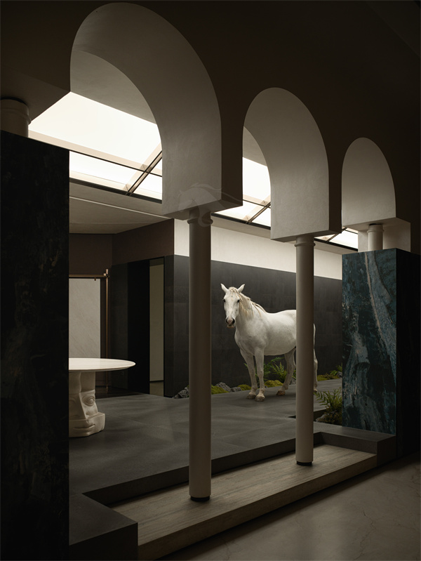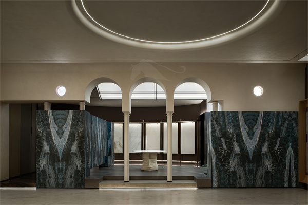 在空间布局上,入口长廊以连续拱券结构营造层层递进的空间韵律,加厚墙体巧妙打造一体式艺术画框,将玛缇瓷砖产品嵌入其中,借助专业定点射灯聚焦肌理质感,如同美术馆珍藏艺术品般逐一呈现,让到访者近距离触摸、品鉴瓷砖的纹理层次与色彩温度。全场统一标准化展框设计,规整视觉秩序,弱化商业推销感,强化 “瓷砖即艺术藏品” 的品牌调性。