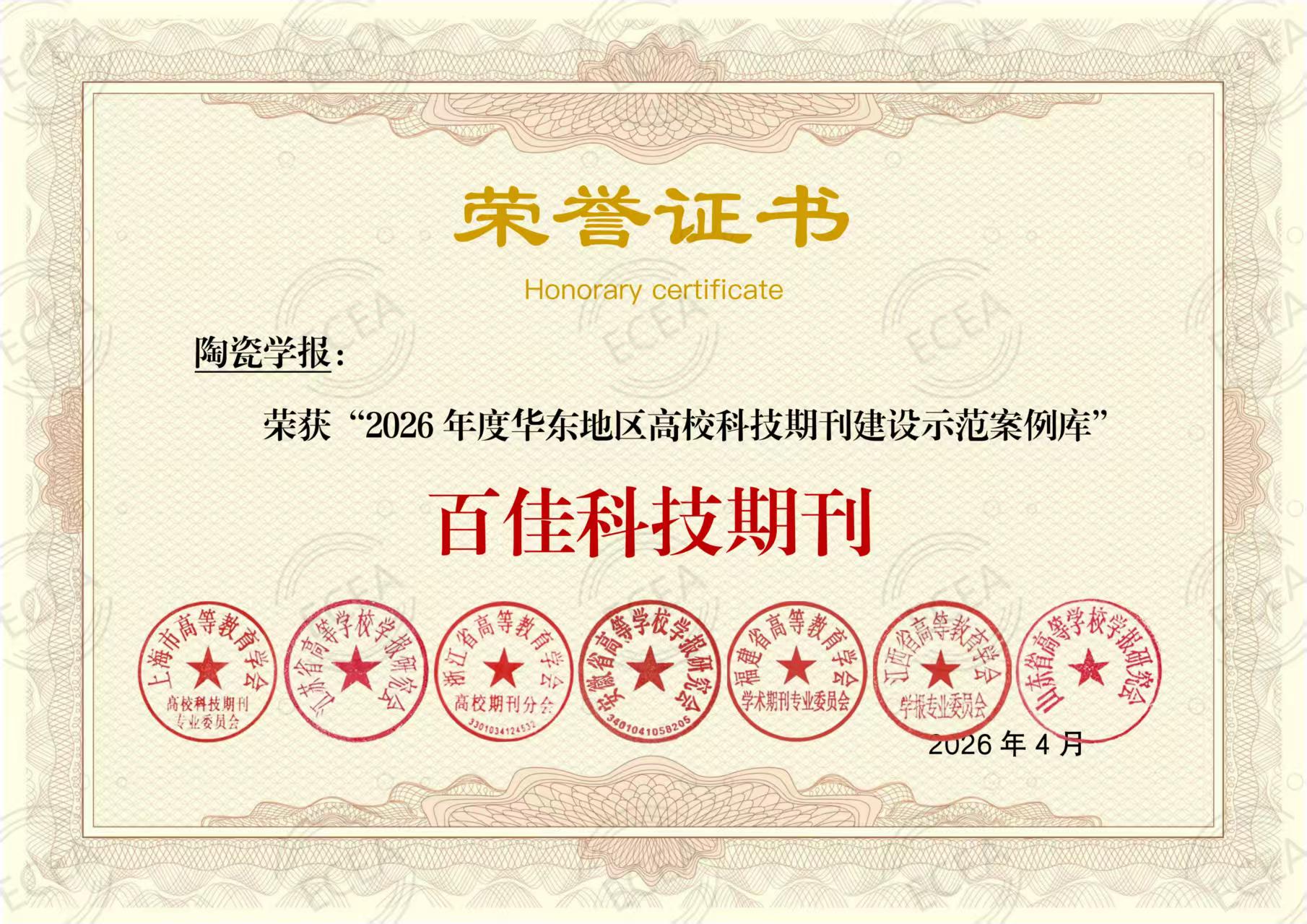 本次评选采用学术质量与编辑出版质量综合评比的方式,最终从华东地区六省一市的高校科技期刊中遴选出114种优秀期刊,江西仅有9本期刊入选。入选华东地区百佳科技期刊,是对《陶瓷学报》办刊成果的充分肯定。