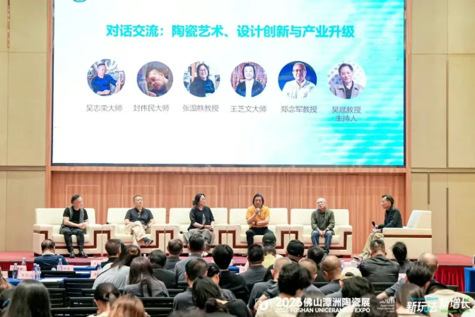 对话交流环节以“陶瓷艺术、设计创新与产业升级”为主题,由佛山大学工业设计与陶瓷艺术学院副院长吴斌教授主持,与广州美术学院教授张温帙、中国工艺美术大师王芝文、中国陶瓷艺术大师封伟民、广东省陶瓷艺术大师吴志荣、广州美术学院教授郑念军五位嘉宾展开深度对话。嘉宾们围绕传统陶艺的当代活化路径、艺术设计如何赋能陶瓷产业升级、青年陶艺家培养体系建设、陶瓷艺术市场发展趋势等行业热点议题各抒己见,从不同维度分享了实践经验与思考判断,为陶瓷艺术与产业融合发展提出了诸多建设性建议。