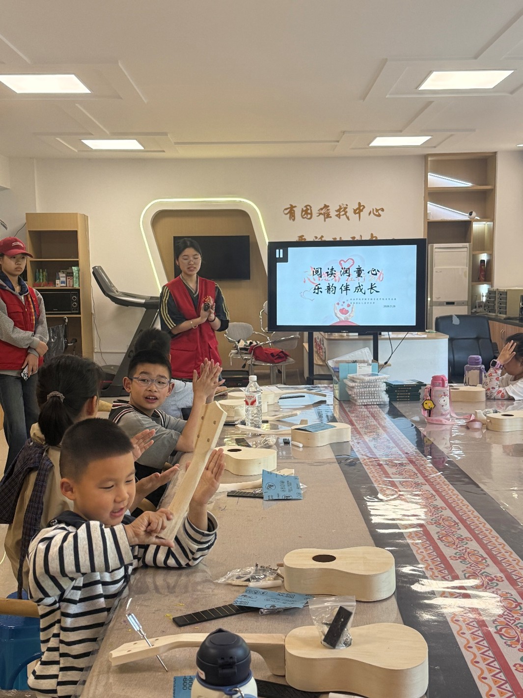 活动现场,来自学院的学生志愿者首先以“致敬劳动者”为主题开展阅读分享,通过讲述各行各业劳动者的奋斗故事,引导孩子们理解劳动创造价值、奋斗成就梦想的深刻内涵,在书香浸润中种下尊重劳动、热爱创造的种子。随后,尤克里里彩绘创作环节正式开启,孩子们在志愿者的耐心指导下,手持画笔在空白琴身上勾勒线条、填充色彩,将对劳动的赞美、对美的想象倾注于笔尖,原本朴素的尤克里里渐渐变成了承载创意的“艺术品”。创作过程中,孩子们不仅锻炼了手部精细动作与手眼协调能力,更在亲手实践中体会到“劳动创造美”的乐趣;我院志愿者们也在服务中实现了美育技能的输出与劳动教育的双向赋能,在陪伴与引导中传递青年学生的责任与温度。