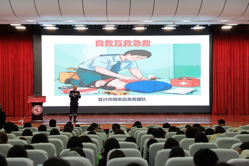 此外,宜兴市城安救援队何波涛以“突发事件自救及互救”为题作专题讲座。他结合近年来发生的各类突发事件典型案例,用通俗易懂的语言详细讲解了火灾逃生、溺水救援、心肺复苏、创伤包扎等应急知识,并通过现场示范、道具演示等方式,直观展示了关键救护技能的操作要点。互动环节中,同学们积极参与模拟演练,主动请教疑问,现场学习氛围浓厚、反响热烈。
