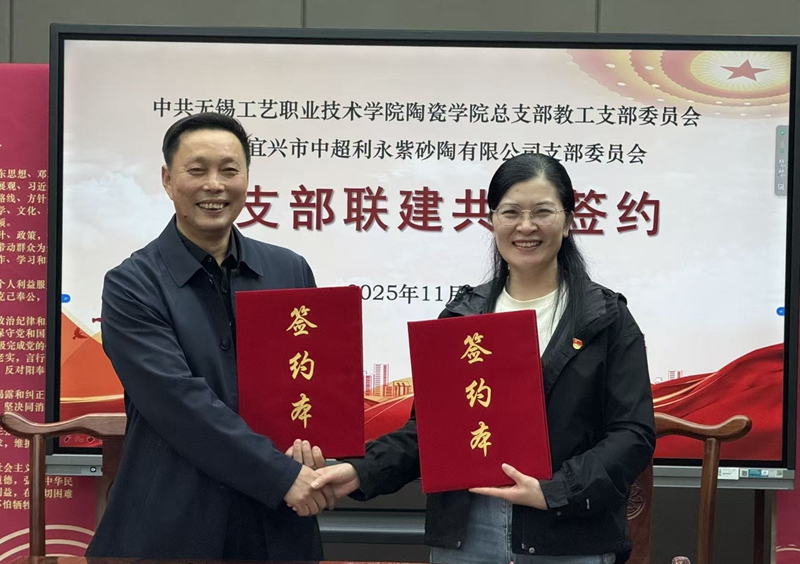 此外,陶瓷学院教工党支部与宜兴市中超利永紫砂陶有限公司党支部举行校企联建共建签约仪式。双方围绕党建引领聚合力、紫砂文化共传承、产学研用深融合、人才培养同发展等核心议题展开深入交流,达成广泛共识。此次校企党建联建,旨在搭建起“党建促业务、校企共发展”的合作平台,为打造校企协同育人新模式注入“红色引擎”,助力实现教育链、人才链与产业链、创新链的有效衔接,推动校企双方互利共赢、共同发展。