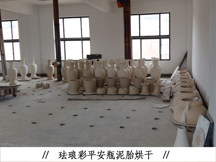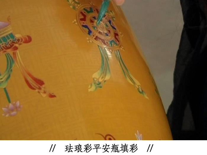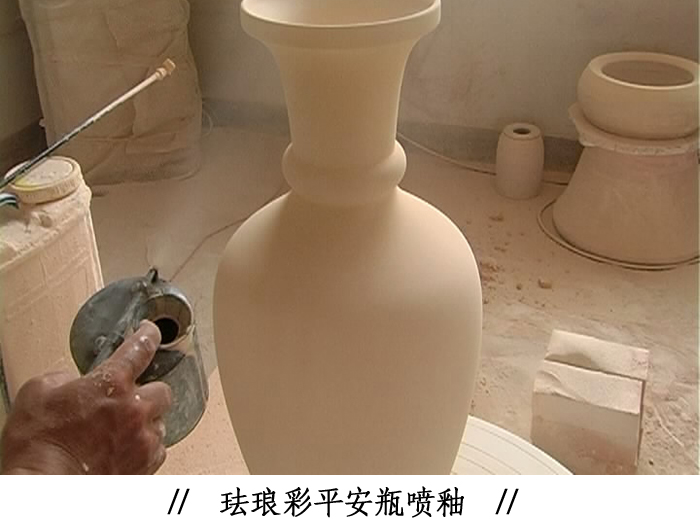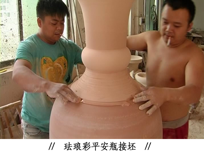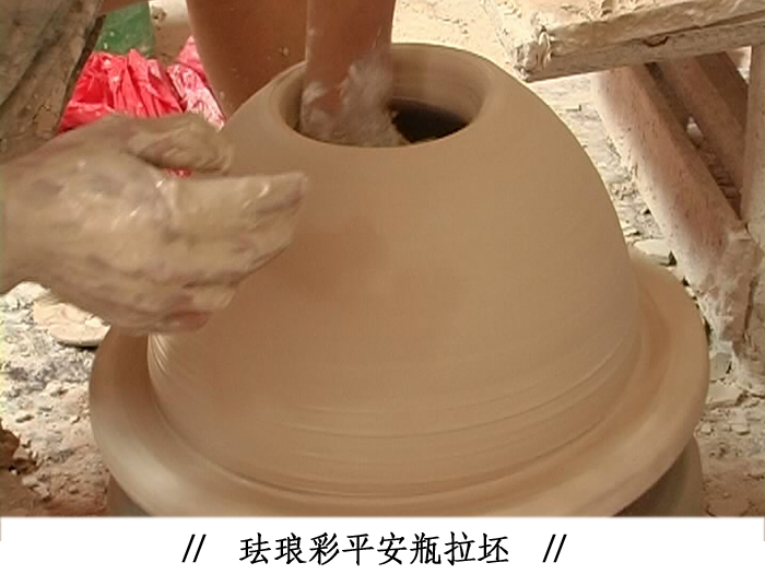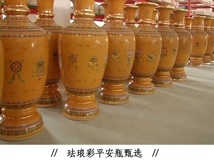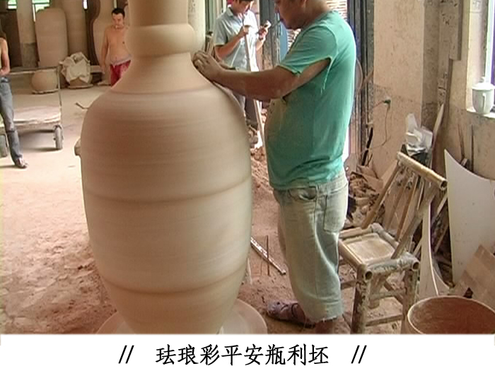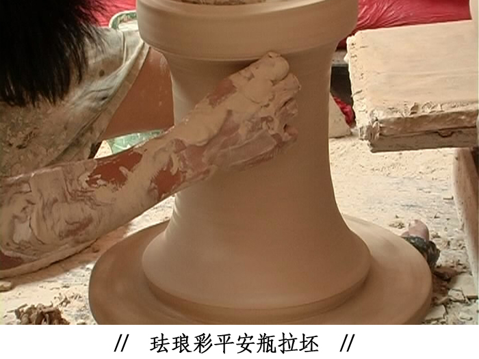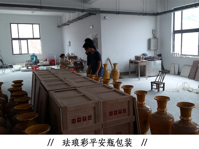平安瓶无论大小均为手工拉坯、利坯而成,上颜色釉烧成后进行彩绘加工。平安瓶装饰图案底纹采用贴花定型。底纹烧成之后再进行手工堆料填彩补色等工序。制造过程之复杂,要求之严格,已是绝无仅有。而这只有一个月的时间。