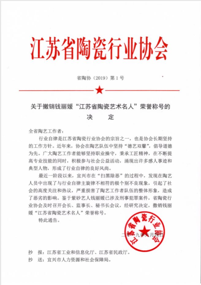 江苏省陶瓷行业协会撤销钱丽媛“江苏省陶瓷艺术名人”荣誉称号