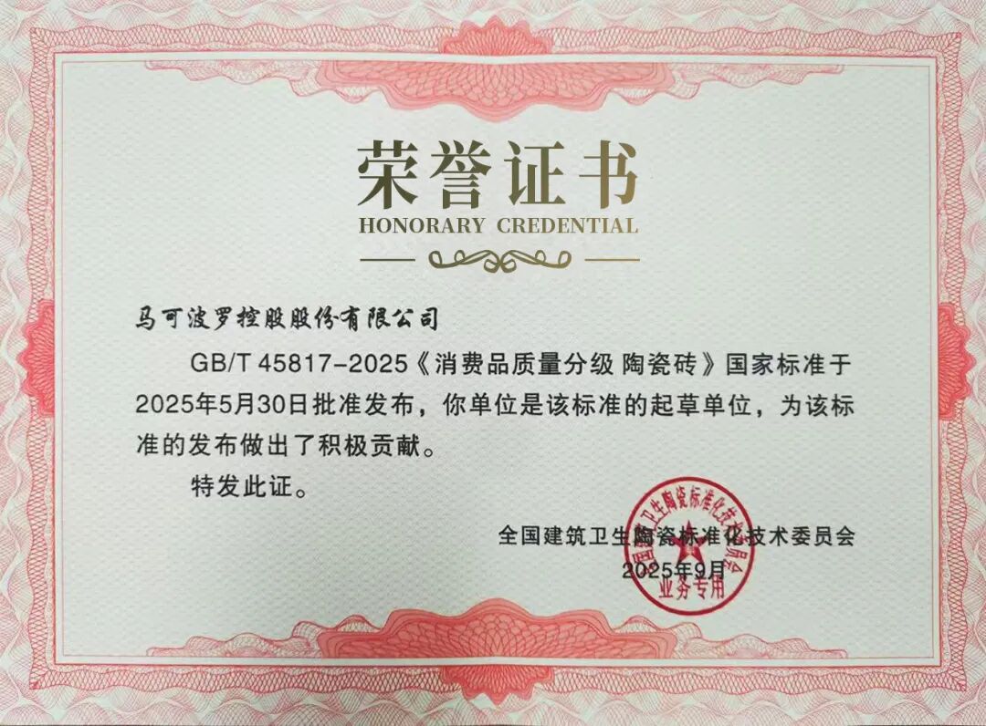 新国标5A级别的严苛标准,对企业在技术研发、生产工艺、品控管理以及智能制造等方面的综合实力提出了更高要求。马可波罗深度参与陶瓷砖分级起草验证全过程,为新国标的科学性、前瞻性和可操作性提供了强有力的实践支持。依托深厚技术积淀和智能制造水平,马可波罗首批率先实现陶瓷砖新国标5A标准产品检测通过。