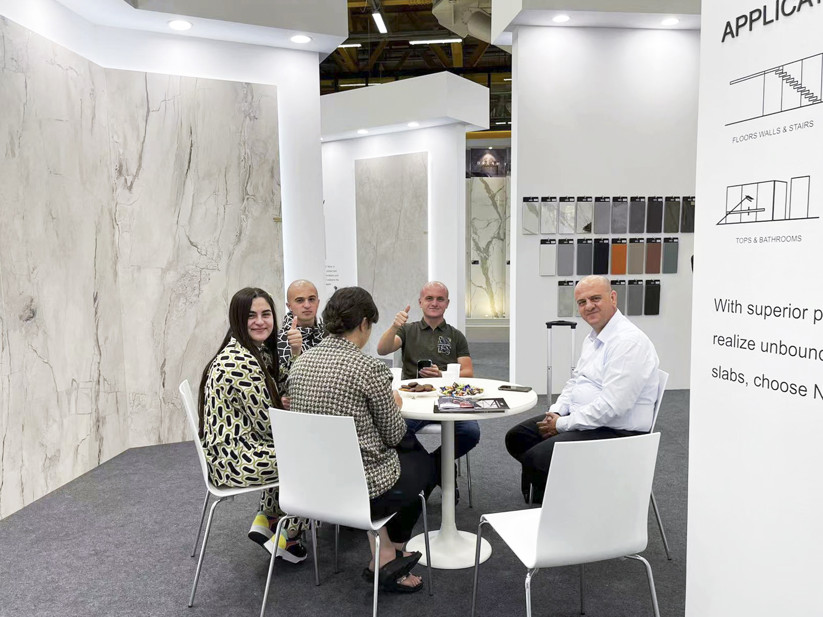 ,并加入陶瓷大板产品应用的展示,以厨房台面、家具、橱柜面板等模式向客户体现产品的最终适用场景。