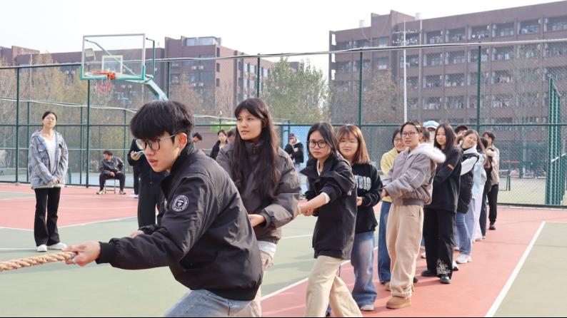 裁判哨声响起,参赛选手们紧握麻绳、弓步后仰,咬紧牙关、全力拼搏。整齐的口号与统一的动作,展现了良好的团队协作精神。场外观赛学生热情高涨,呐喊声、助威声此起彼伏,以实际行动诠释了“团结就是力量”。