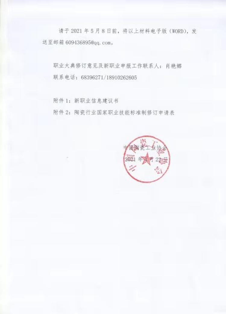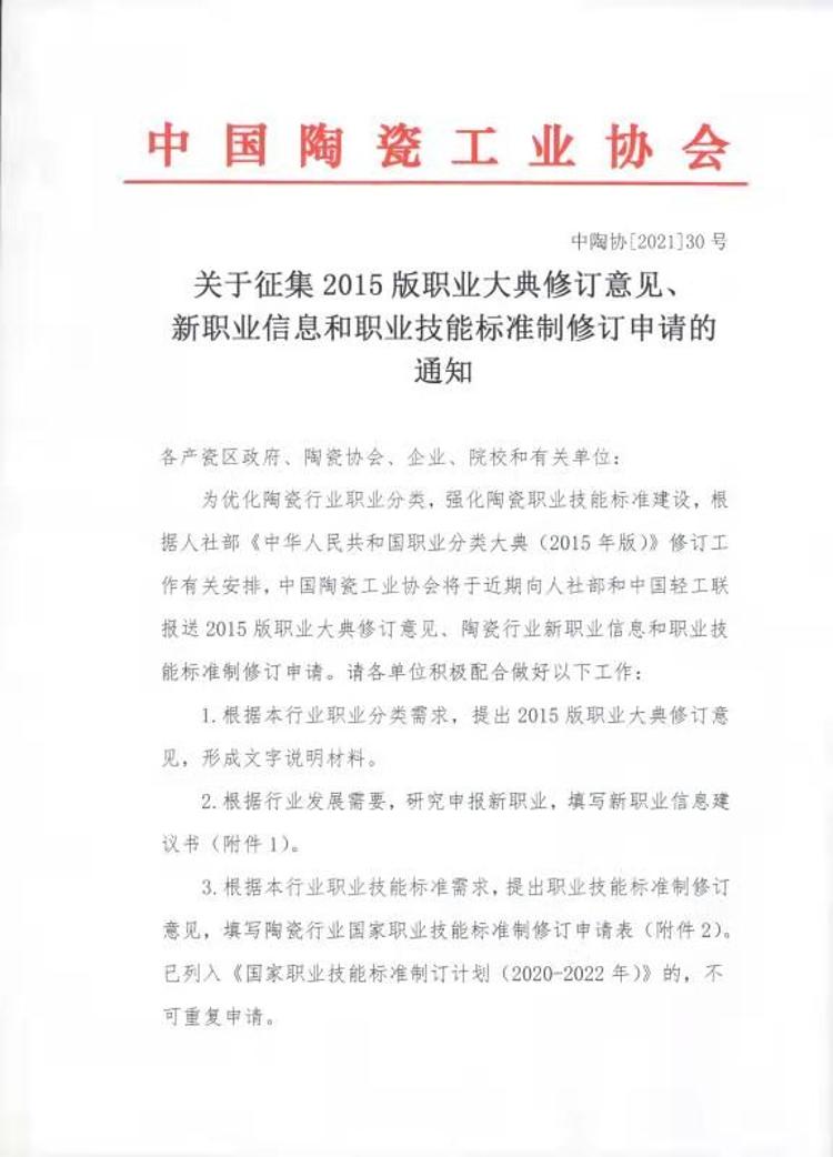 为优化陶瓷行业职业分类,强化陶瓷职业技能标准建设,根据人社部《中华人民共和国职业分类大典(2015年版)》修订工作有关安排,中国陶瓷工业协会将于近期向人社部和中国轻工联报送2015版职业大典修订意见、陶瓷行业新职业信息和职业技能标准制修订申请。请各单位积极配合做好以下工作: