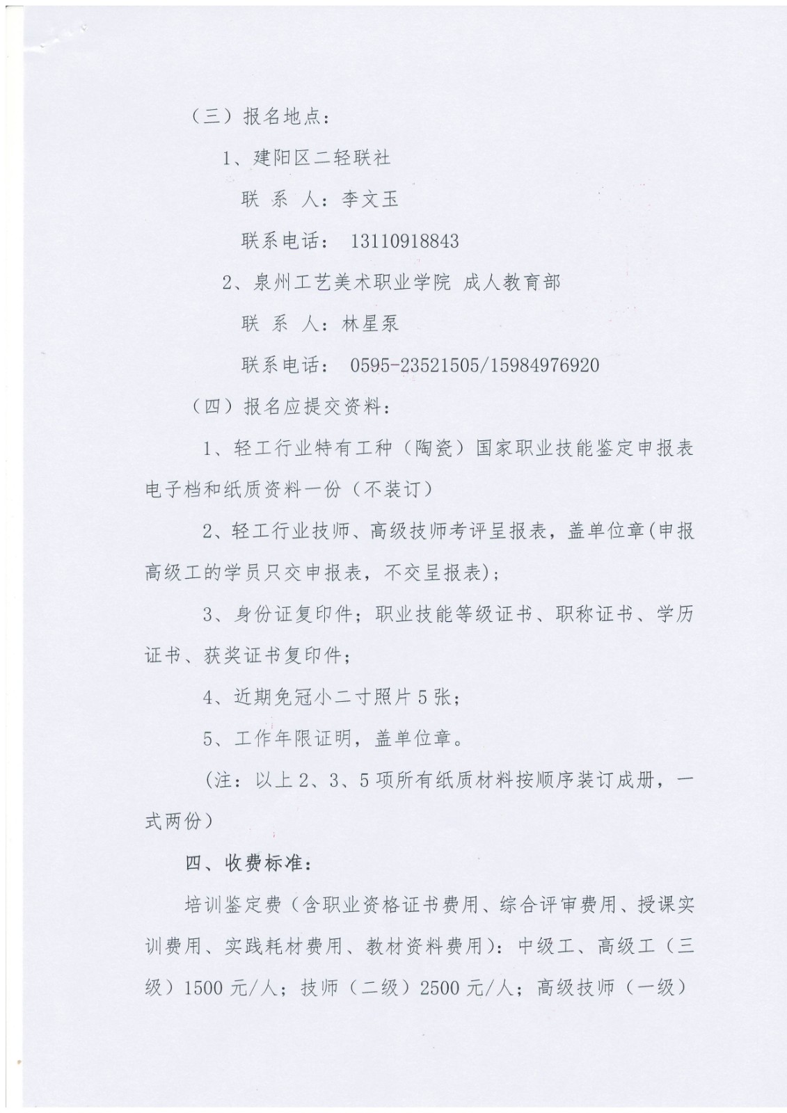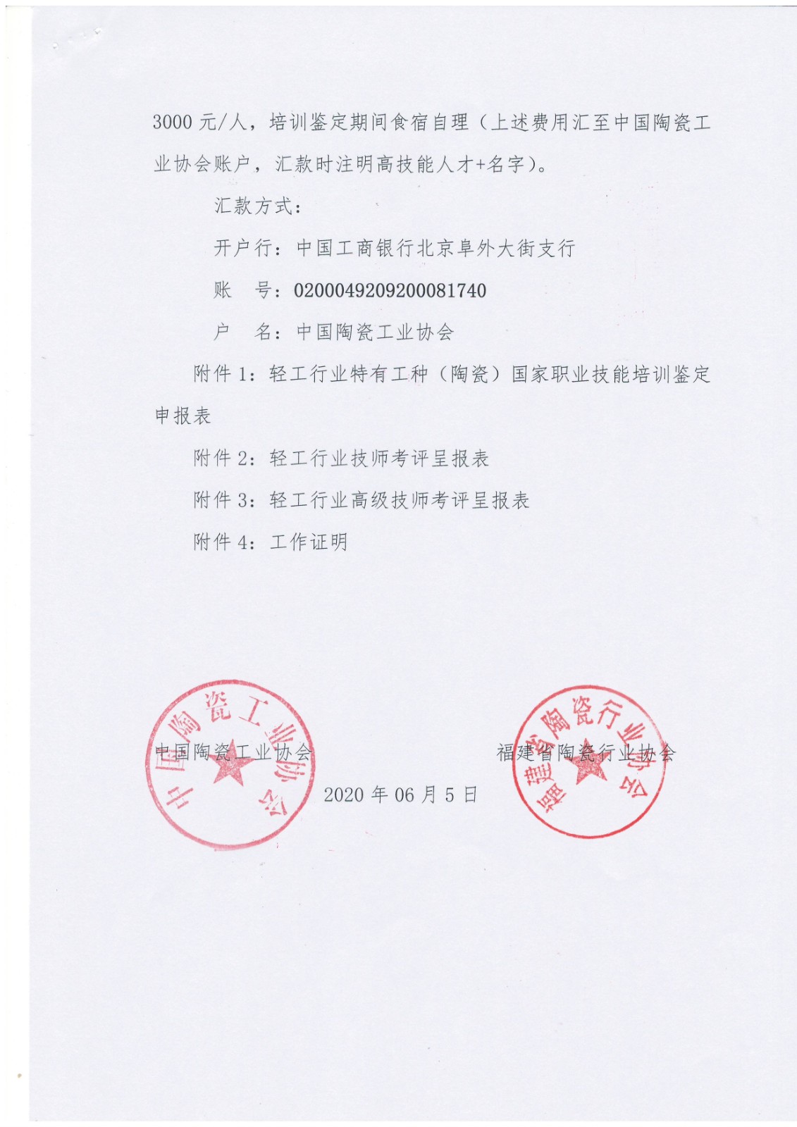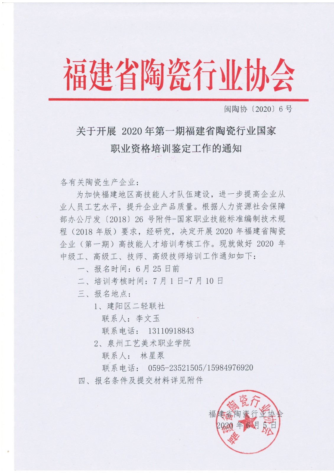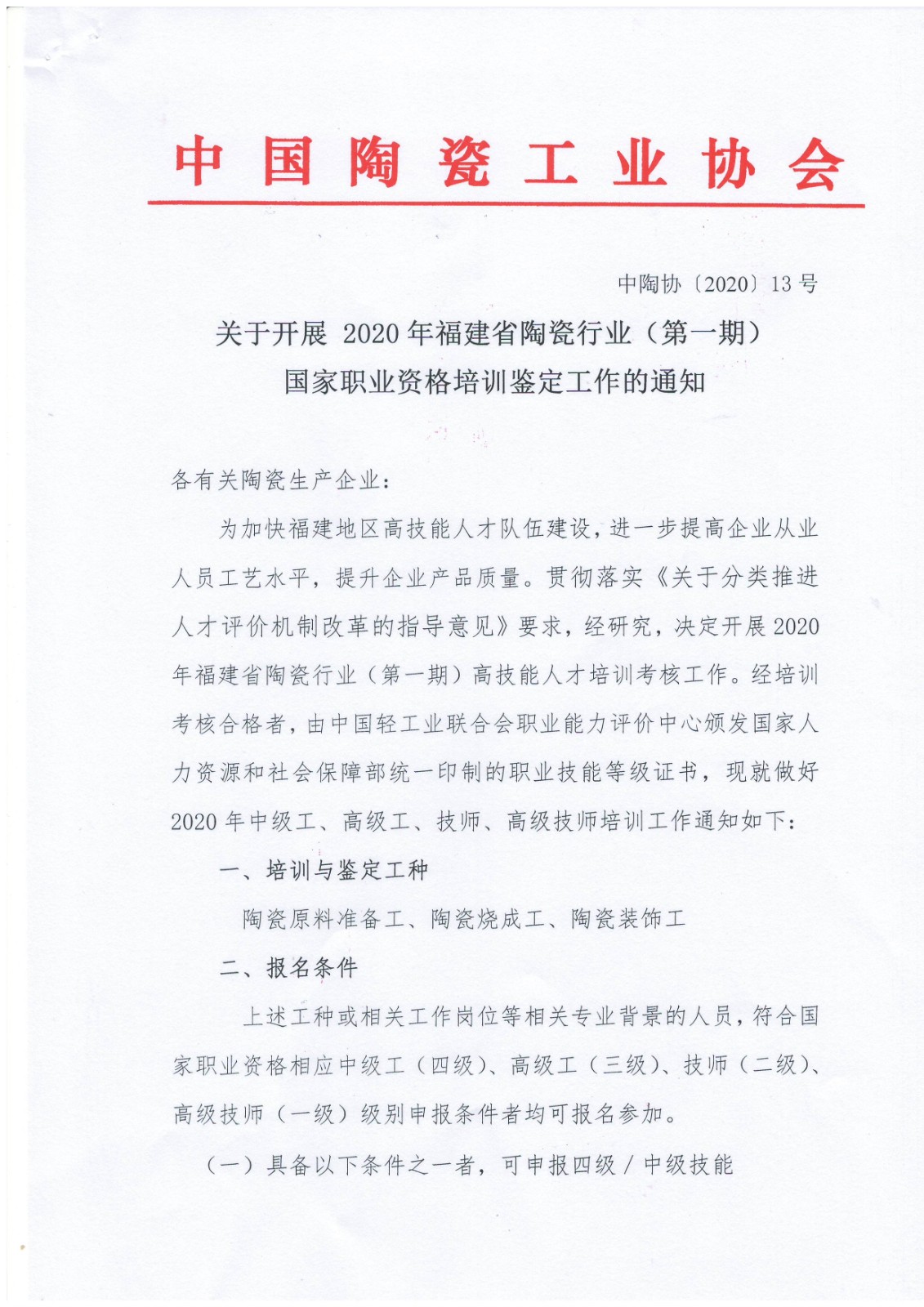 关于开展 2020年第一期福建省陶瓷行业国家职业资格培训鉴定工作的通知