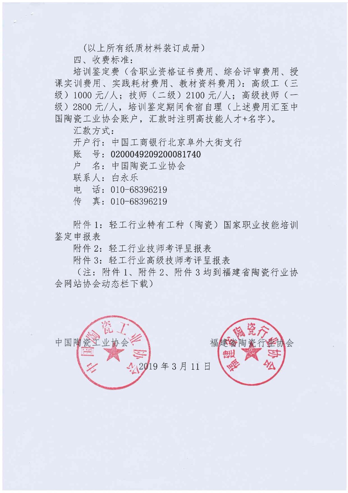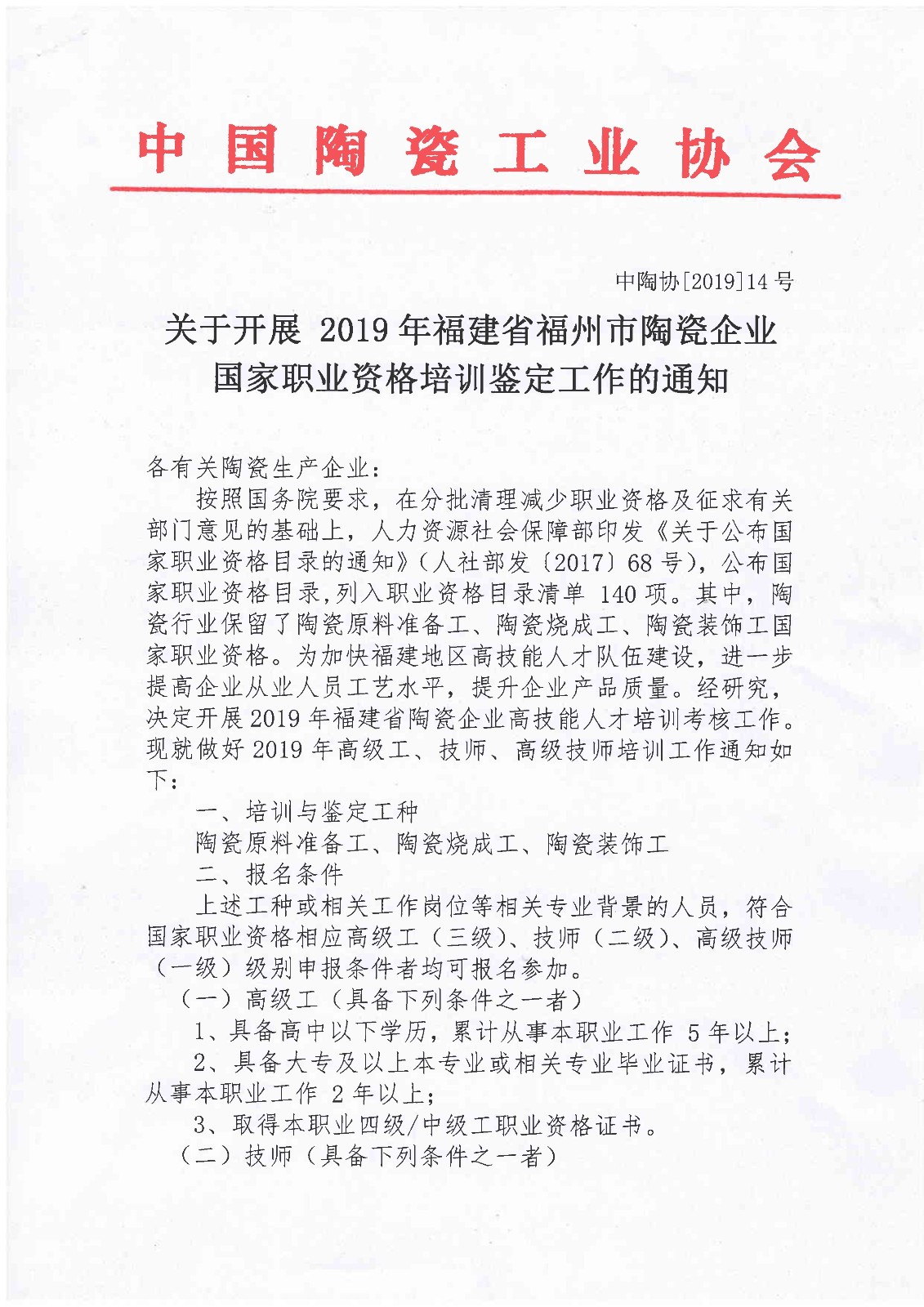 关于开展 2019年福建省陶瓷企业国家职业资格培训鉴定工作的通知